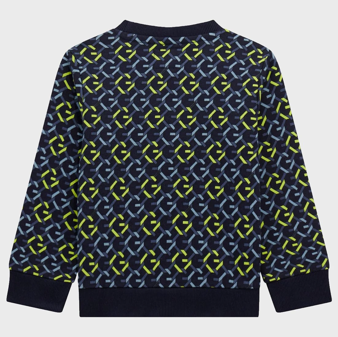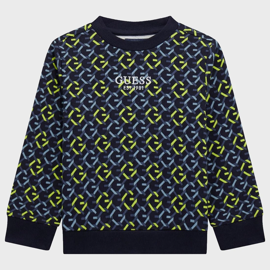 Felpa GUESS con interno garzato in cotone ,modello girocollo a manica lunga, fantasia stampata e logo ricamato , chiusura clips su spalla dalla taglia 3/6mesi alla taglia 24mesi.