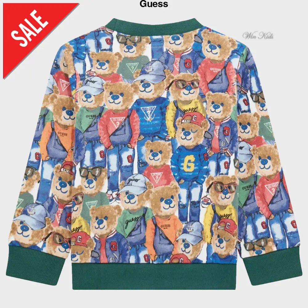 Felpa GUESS con interno garzato in cotone ,modello girocollo manica lunga a fantasia con stampa logata ,chiusura clips su spalla dalla taglia 3/6mesi alla taglia 24mesi.