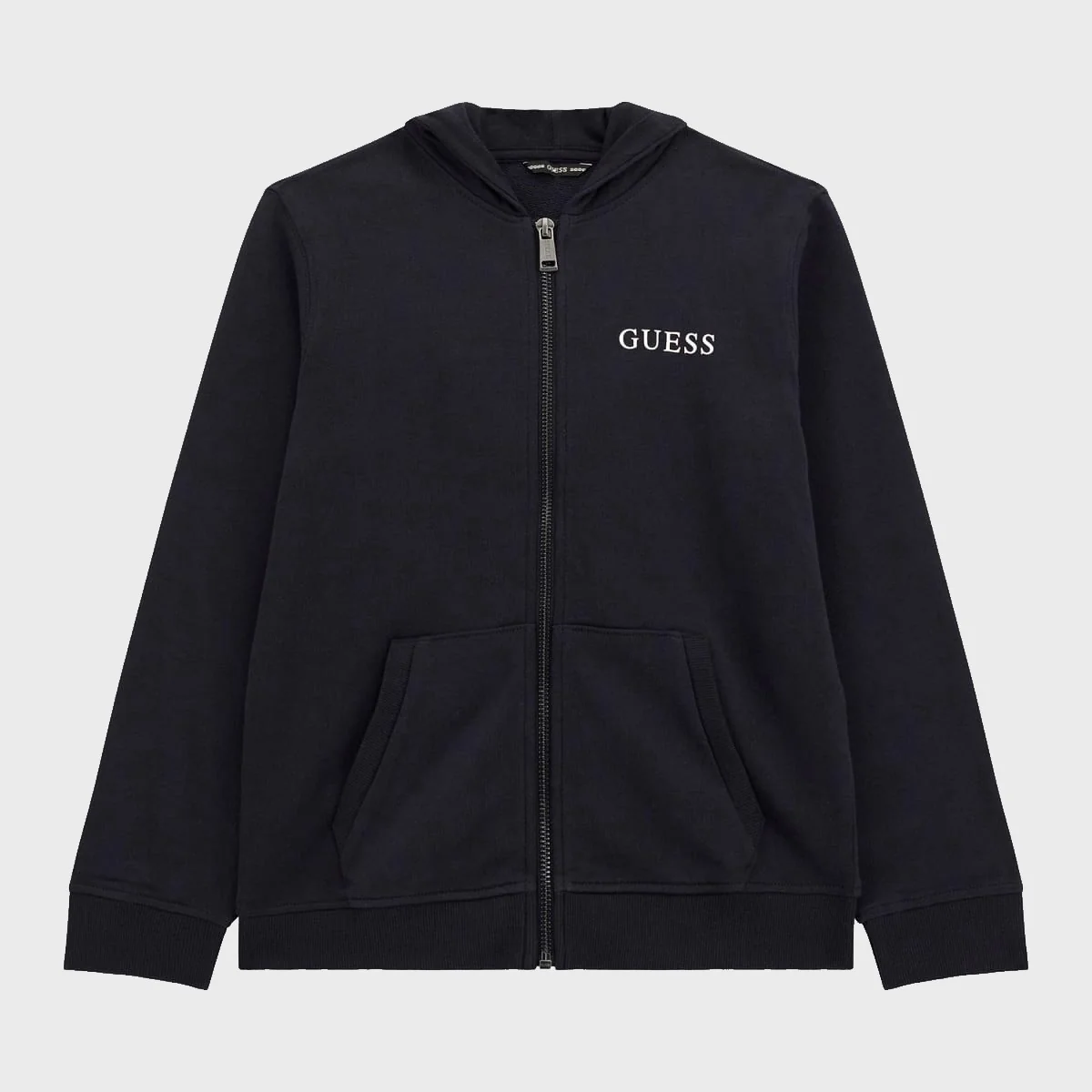 Felpa GUESS in cotone garzato con stampa sul retro , chiusura con zip e cappuccio.