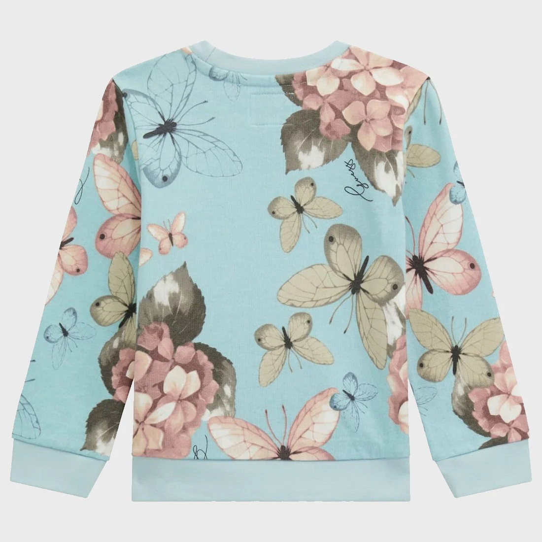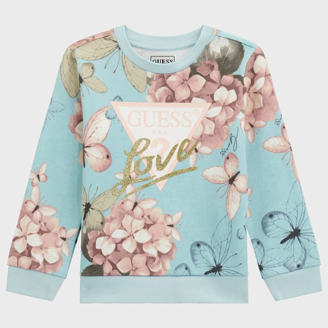 Felpa GUESS con interno garzato in cotone, modello girocollo manica lunga a fantasia , stampa logo glitterata a rilievo , polsini elastici ,dalla taglia 3/6mesi alla taglia 24mesi chiusura clips su spalla.