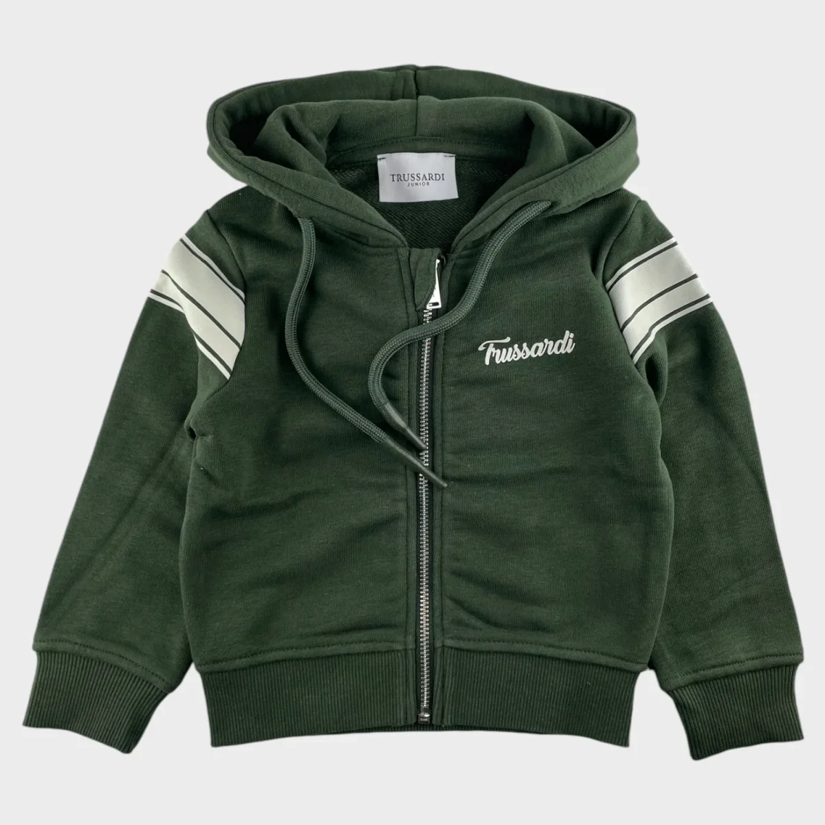 Felpa TRUSSARDI bambino con cappuccio, in cotone garzato con stampe a contrasto e logo sul retro a rilievo trussardi.