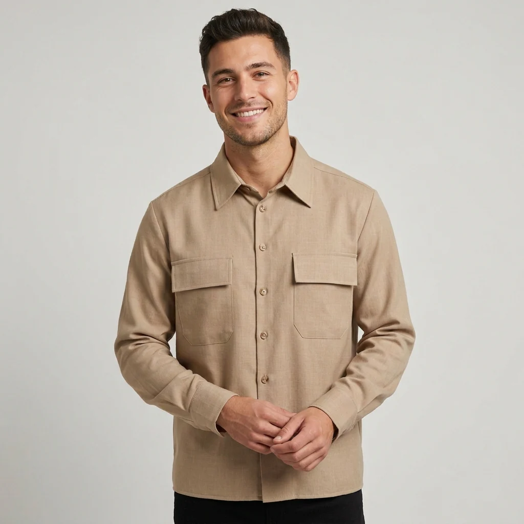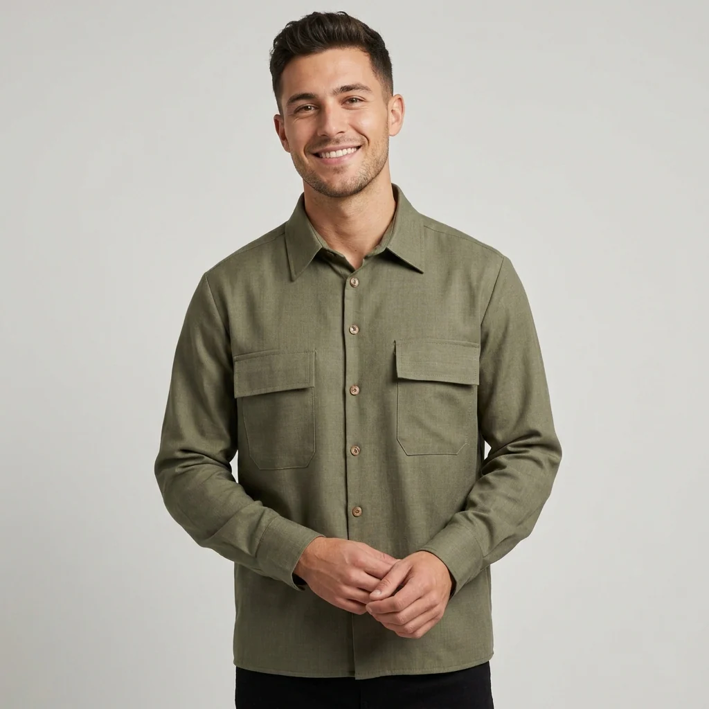 Camicia uomo modello overshirt. Colletto piccolo, chiusura con bottoni in tinta, taschine applicate sul petto. Vestibilità ampia. Crea il completo con il pantalone abbinato. Composizione tessuto 97% poliestere 3% elastan.