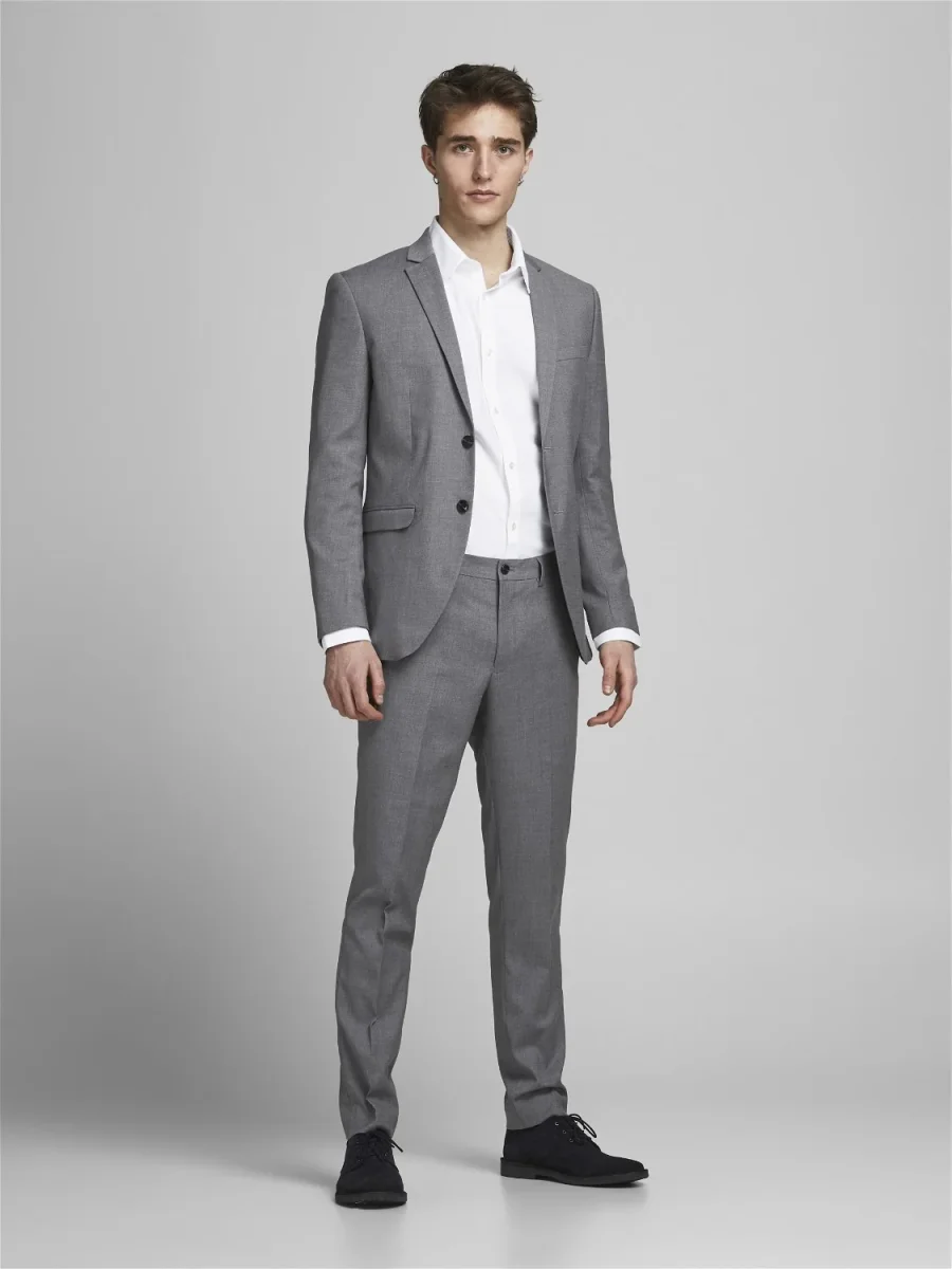 Abito vestibilità super slim. Giacca modello blazer. Chiusura a due bottoni, vestibilità super slim. Collo con revers stretti. Tasche laterali con patta applicata. Foderata. Pantalone super slim fit in tessuto misto viscosa. Vita regolare, cinturino con passanti, chiusura con zip e bottone. Tasche a filo laterali. Gamba e fondo super slim. Il modello in foto indossa la taglia 48. Composizione tessuto 78% poliestere 17% viscosa 5% elastan, fodera giacca 100% poliestere.