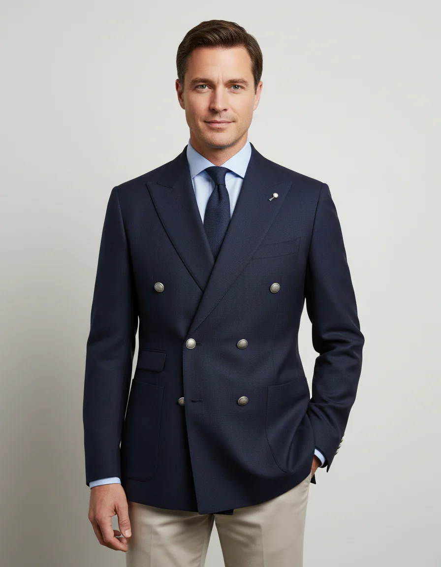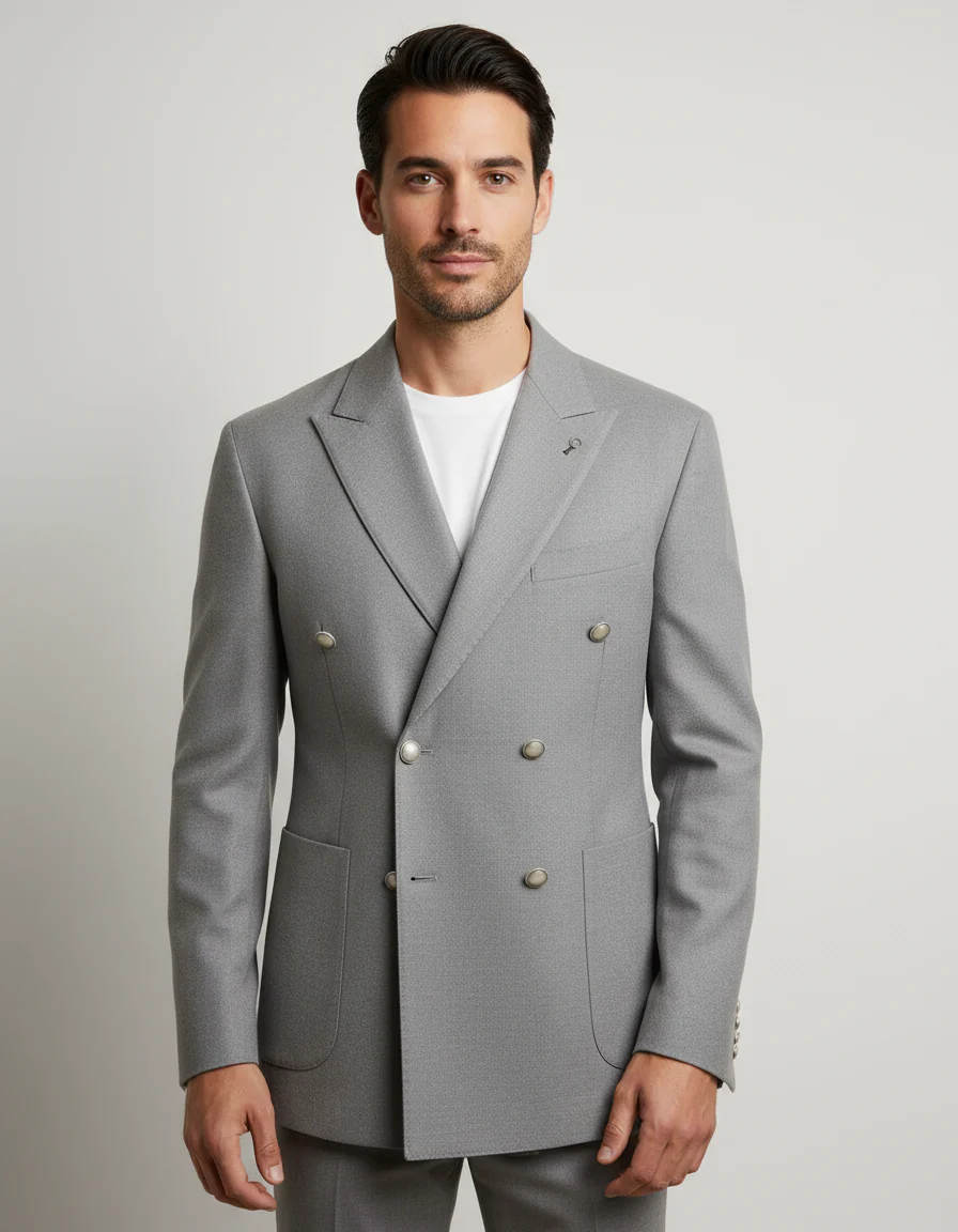 Giacca uomo doppio petto in tessuto misto viscosa mano lana. Revers a lancia, chiusura doppio petto con bottoni ottonati. Taschino sul petto e tasche a toppa sul davanti. Capo non foderato. Vestibilità regolare. Crea l’abito con i pantaloni abbinati. Composizione tessuto 68% poliestere 30% viscosa 2% elastan.