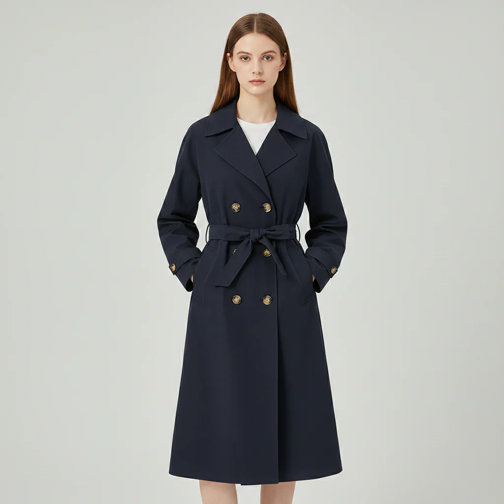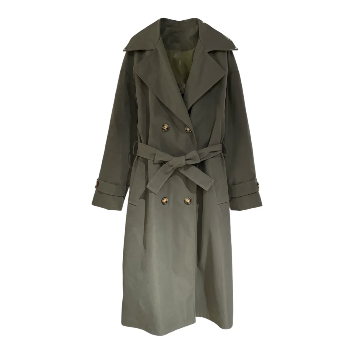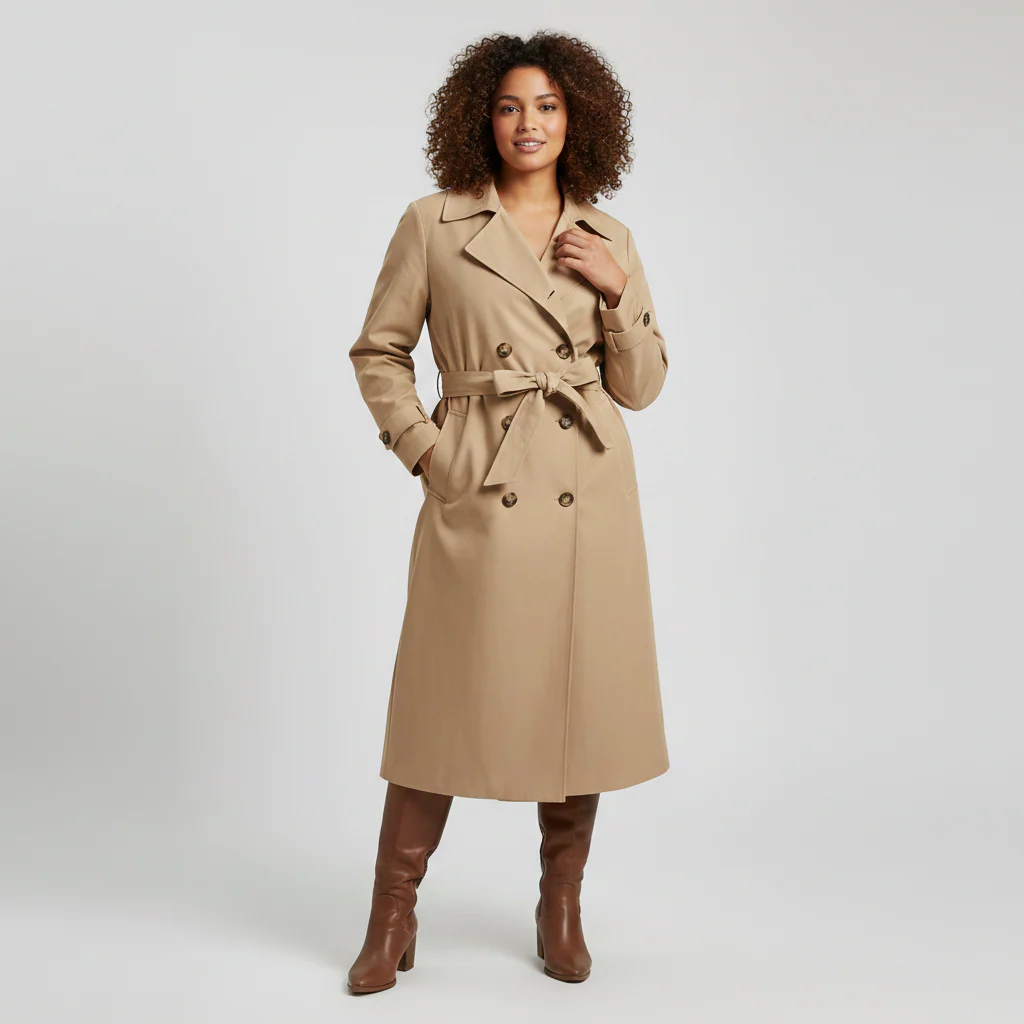 Trench donna in tessuto tecnico mano cotone. Collo con ampi revers a lancia, chiusura doppio petto con bottoni lavorati, cintura in tinta. Tasche laterali con bordo largo. Vestibilità dritta, capo foderato. Composizione tessuto 100% poliestere.