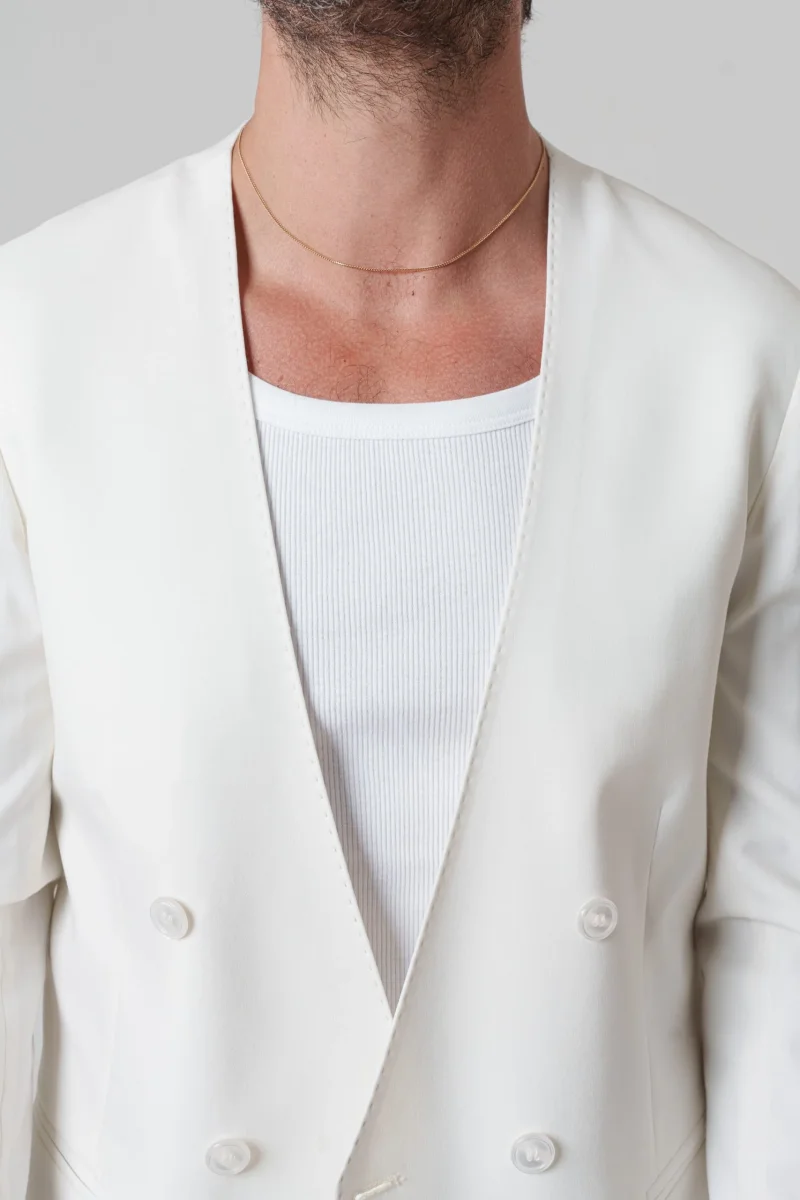La giacca Blacket rappresenta un’evoluzione del classico doppiopetto, caratterizzata da un design pulito e moderno. Questa giacca semi-sartoriale offre un’ottima vestibilità e un comfort eccezionale. Il rever sciallato aperto senza collo conferisce al capo un aspetto minimalista ma di grande impatto visivo, mentre la chiusura doppiopetto a quattro bottoni aggiunge un tocco di eleganza senza tempo. Le tasche con pattina integrata completano il look, rendendo questa giacca perfetta per eventi formali o per un abbigliamento ricercato in contesti meno convenzionali.