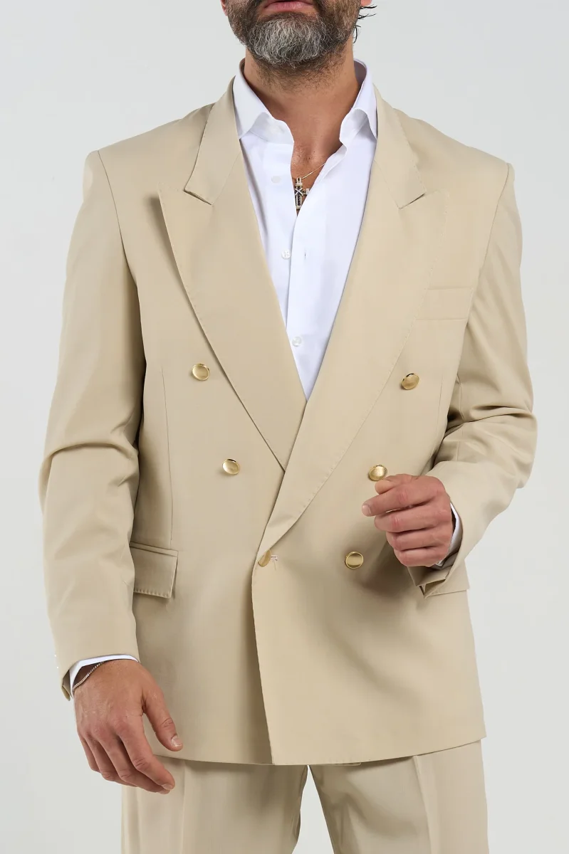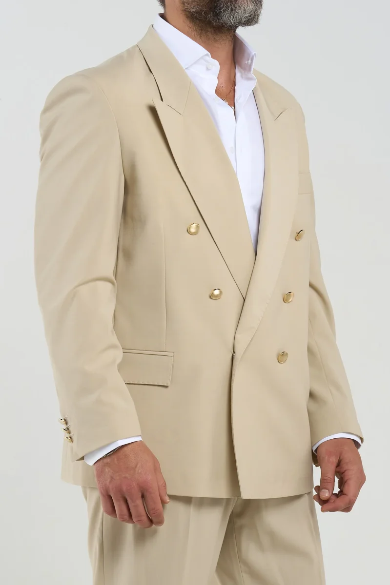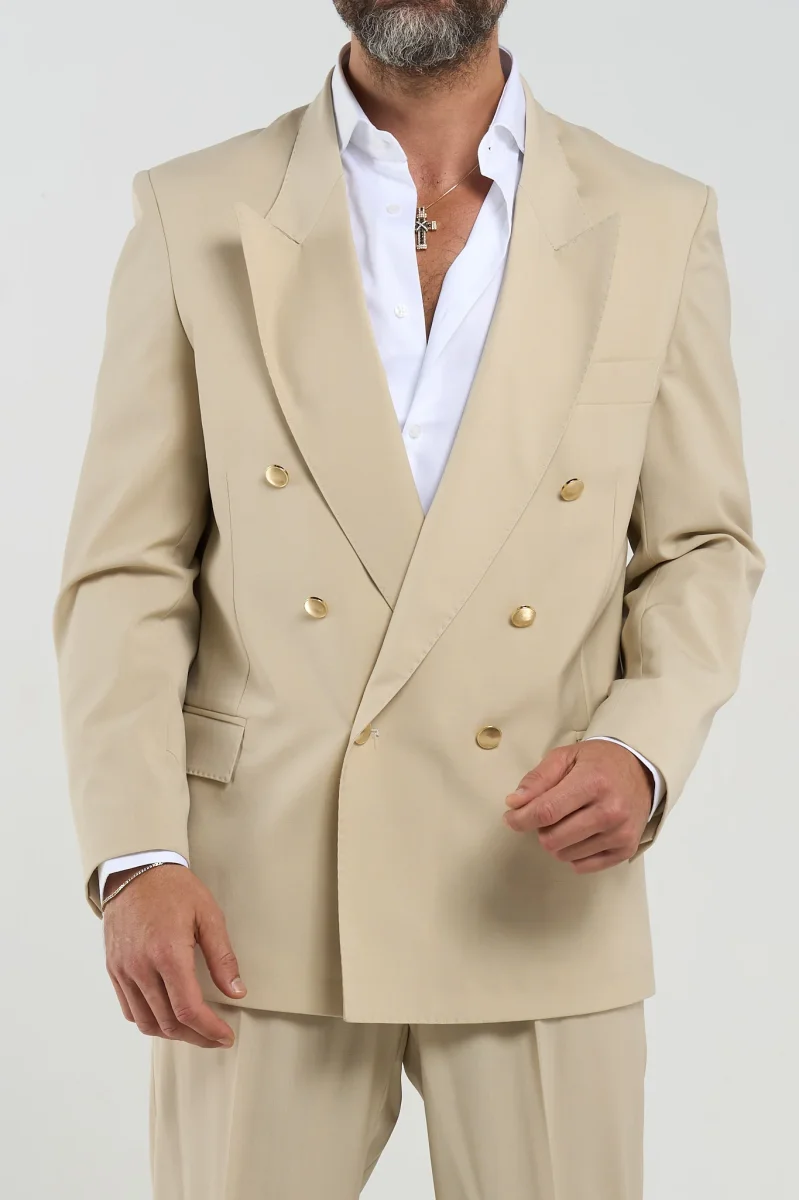 Questa giacca è un capo formale dallo stile classico ed elegante, con caratteristiche distintive che la rendono perfetta per un look raffinato e autorevole. E’ un doppiopetto a sei bottoni in oro light (2×3), con chiusura asimmetrica che donano un forte accento di eleganza. il taglio è un regular fit, non troppo aderente, con caduta naturale e composta e la lunghezza leggermente sotto i fianchi rende la giacca da tradizione sartoriale.