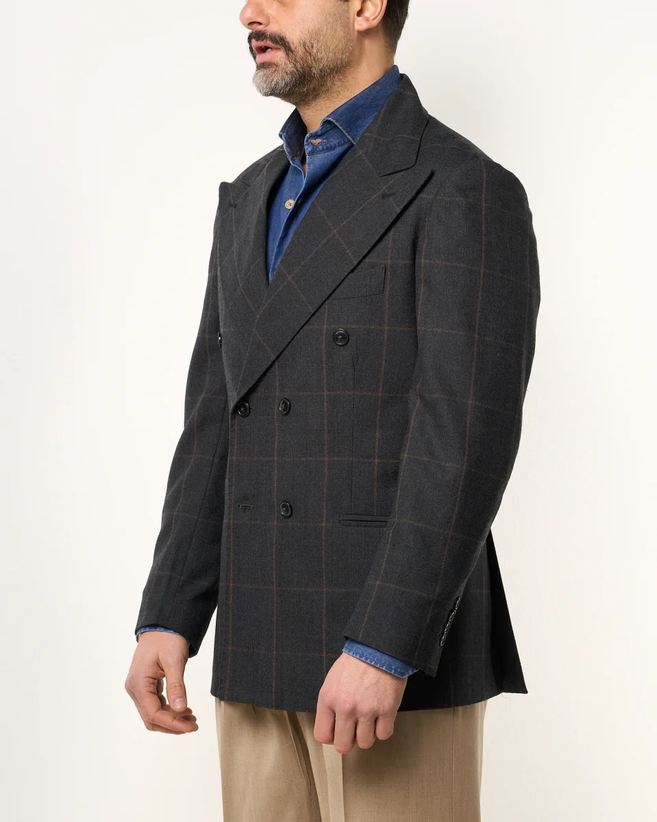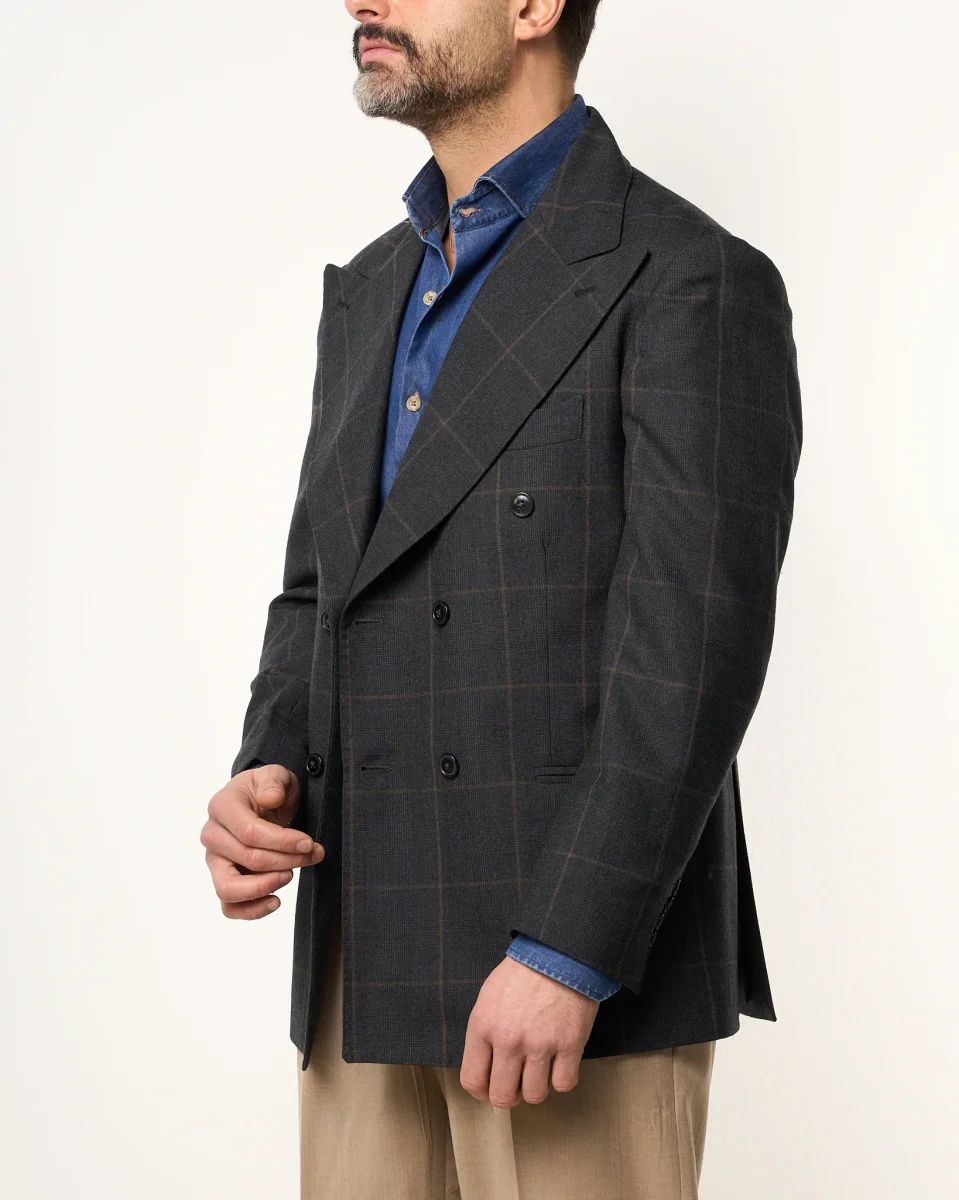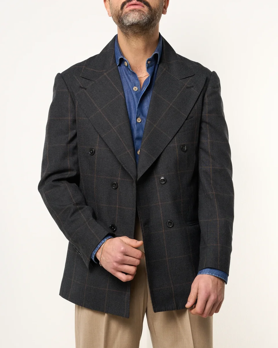 Abbiamo reinterpretato la nostra giacca iconica ma questa volta con una abbottonatura centrale 6×2, rever a lancia leggermente arrotondato e spallina liscia senza arriccio, per un equilibrio perfetto tra struttura e naturalezza. Un fit pulito, essenziale, che valorizza la linea del corpo senza costrizioni. È la nostra visione dell’eleganza contemporanea: più libera, più autentica, ma sempre impeccabile.