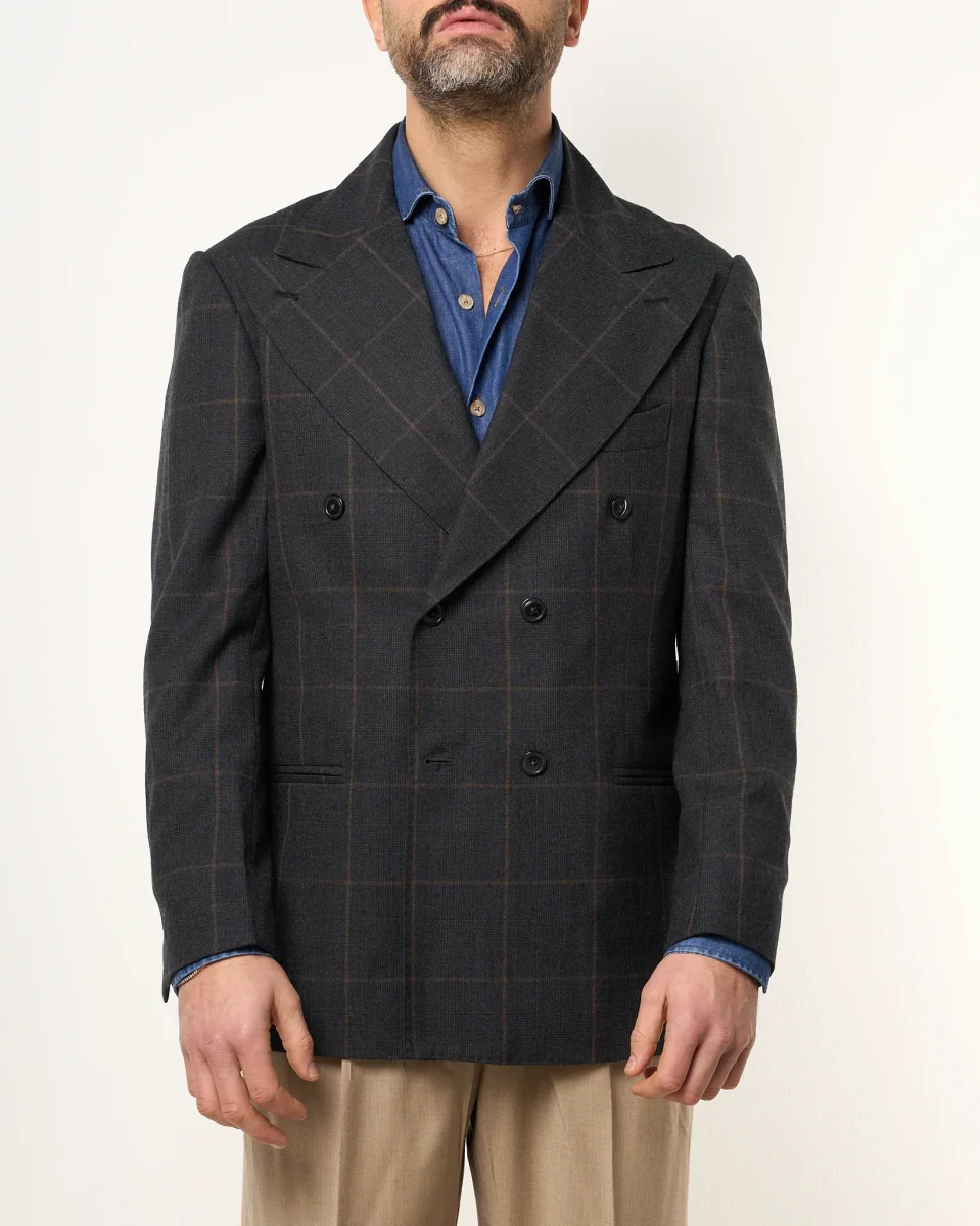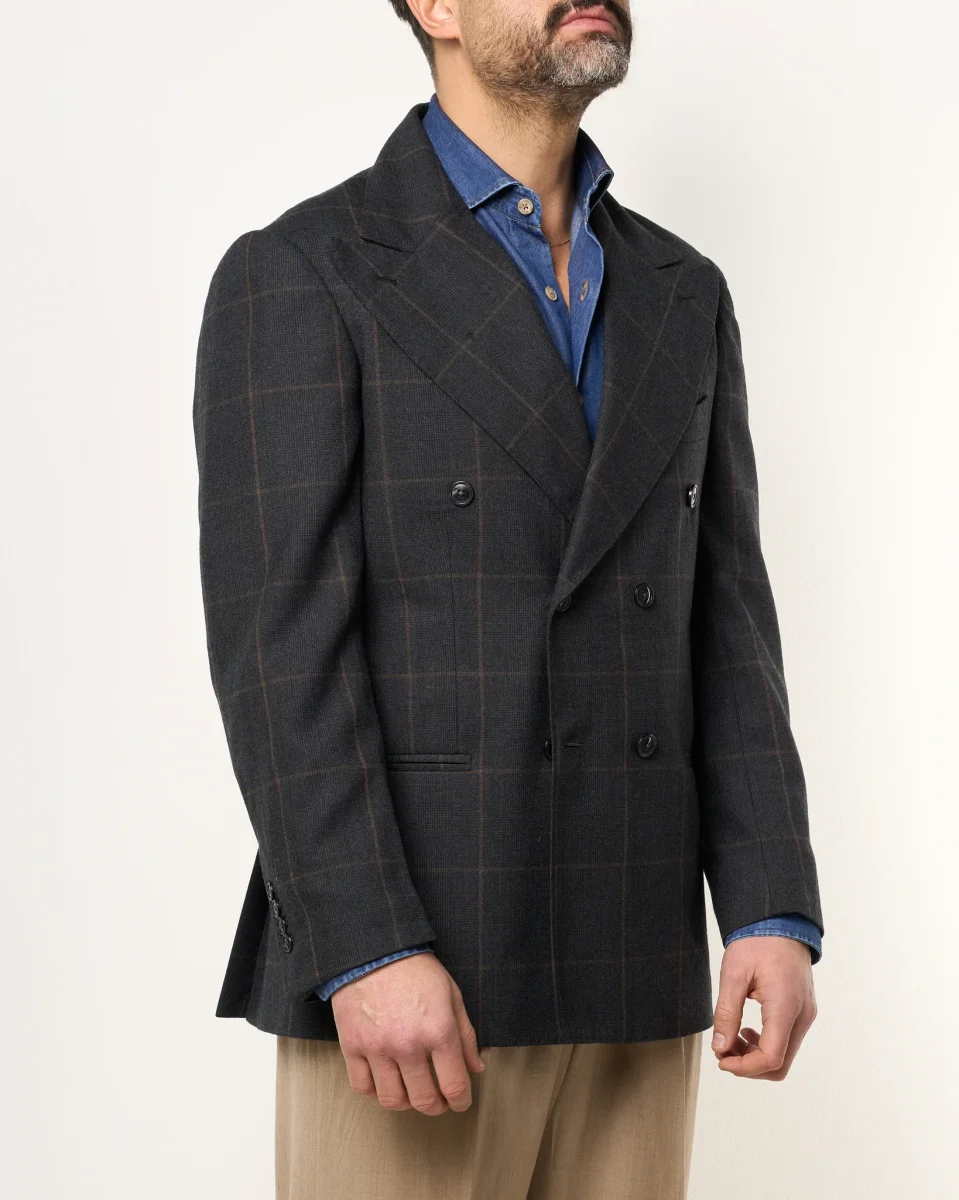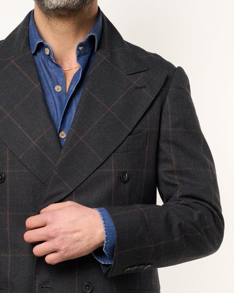Abbiamo reinterpretato la nostra giacca iconica ma questa volta con una abbottonatura centrale 6×2, rever a lancia leggermente arrotondato e spallina liscia senza arriccio, per un equilibrio perfetto tra struttura e naturalezza. Un fit pulito, essenziale, che valorizza la linea del corpo senza costrizioni. È la nostra visione dell’eleganza contemporanea: più libera, più autentica, ma sempre impeccabile.