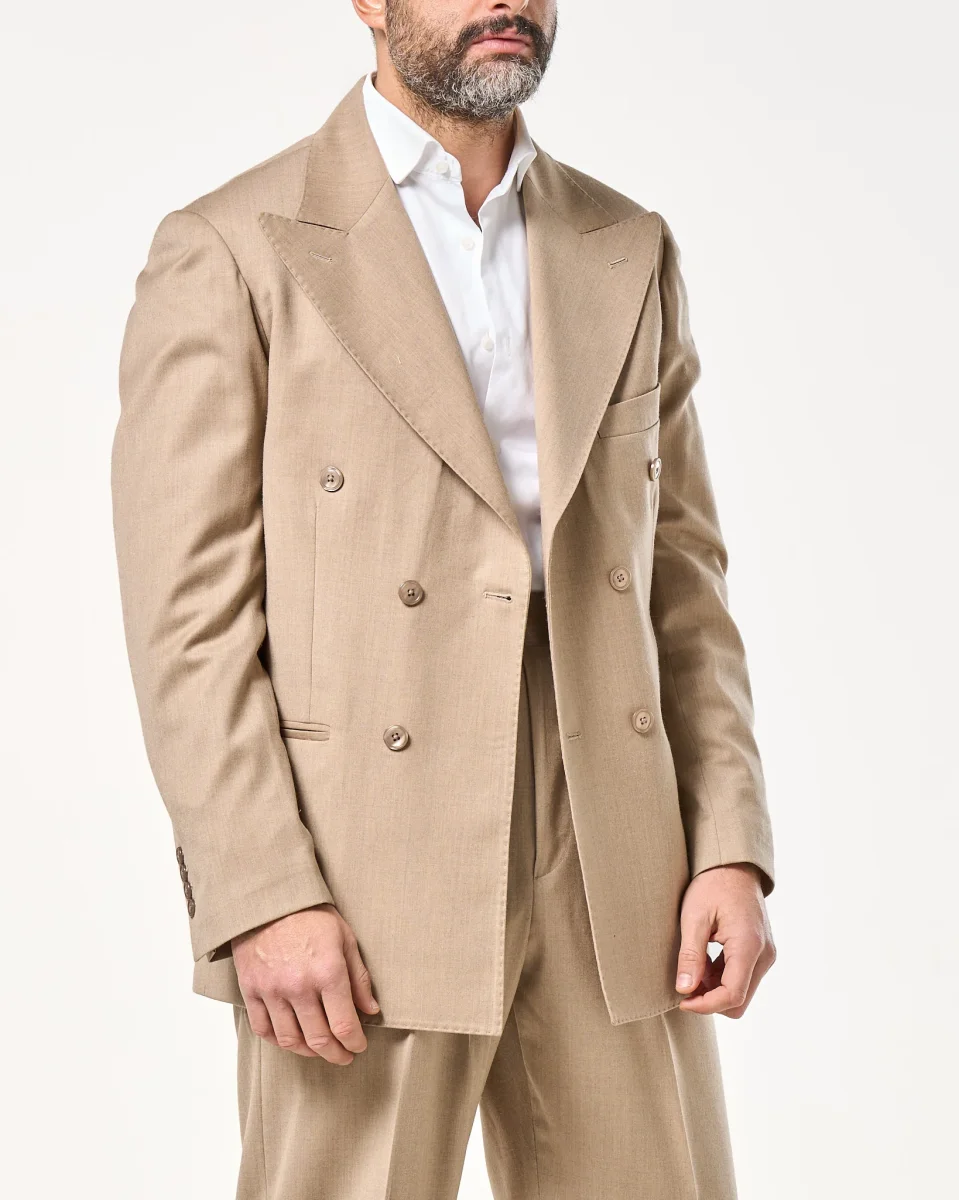 Giacca Doppiopetto in Lana Foulè con Abbottonatura Centrale e Rever a Lancia Beige
