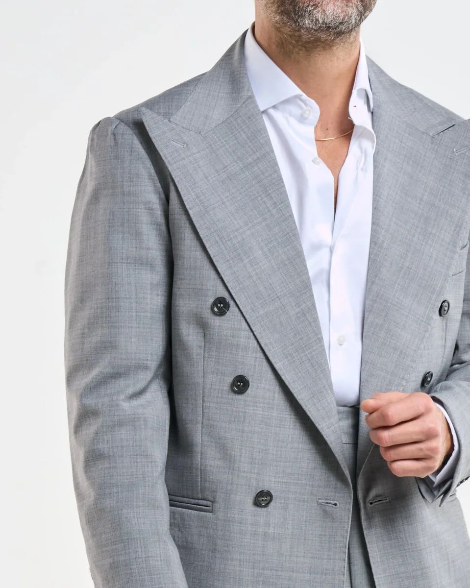 La giacca doppiopetto Jocket rappresenta l’equilibrio perfetto tra sartorialità classica e stile contemporaneo. Si distingue per la sua linea pulita e la sua vestibilità impeccabile. Il rever a lancia ampio e strutturato dona un aspetto deciso e sofisticato, mentre la chiusura a sei bottoni con abbottonatura bassa, sull’ultimo bottone, conferisce un tocco di tradizione e modernità. Ideale per occasioni formali, ma facilmente abbinabile anche in contesti meno convenzionali, questa giacca è un must-have per l’uomo che ama esprimere eleganza e personalità attraverso i propri outfit.