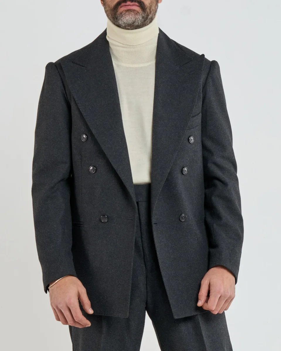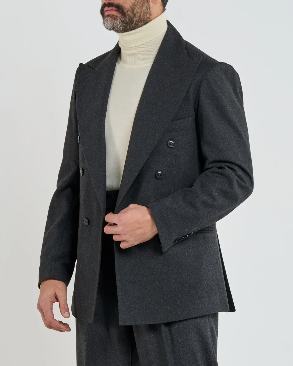 La giacca doppiopetto Jocket rappresenta l’equilibrio perfetto tra sartorialità classica e stile contemporaneo. Si distingue per la sua linea pulita e la sua vestibilità impeccabile. Il rever a lancia ampio e strutturato dona un aspetto deciso e sofisticato, mentre la chiusura a sei bottoni con abbottonatura bassa, sull’ultimo bottone, conferisce un tocco di tradizione e modernità. Ideale per occasioni formali, ma facilmente abbinabile anche in contesti meno convenzionali, questa giacca è un must-have per l’uomo che ama esprimere eleganza e personalità attraverso i propri outfit.
