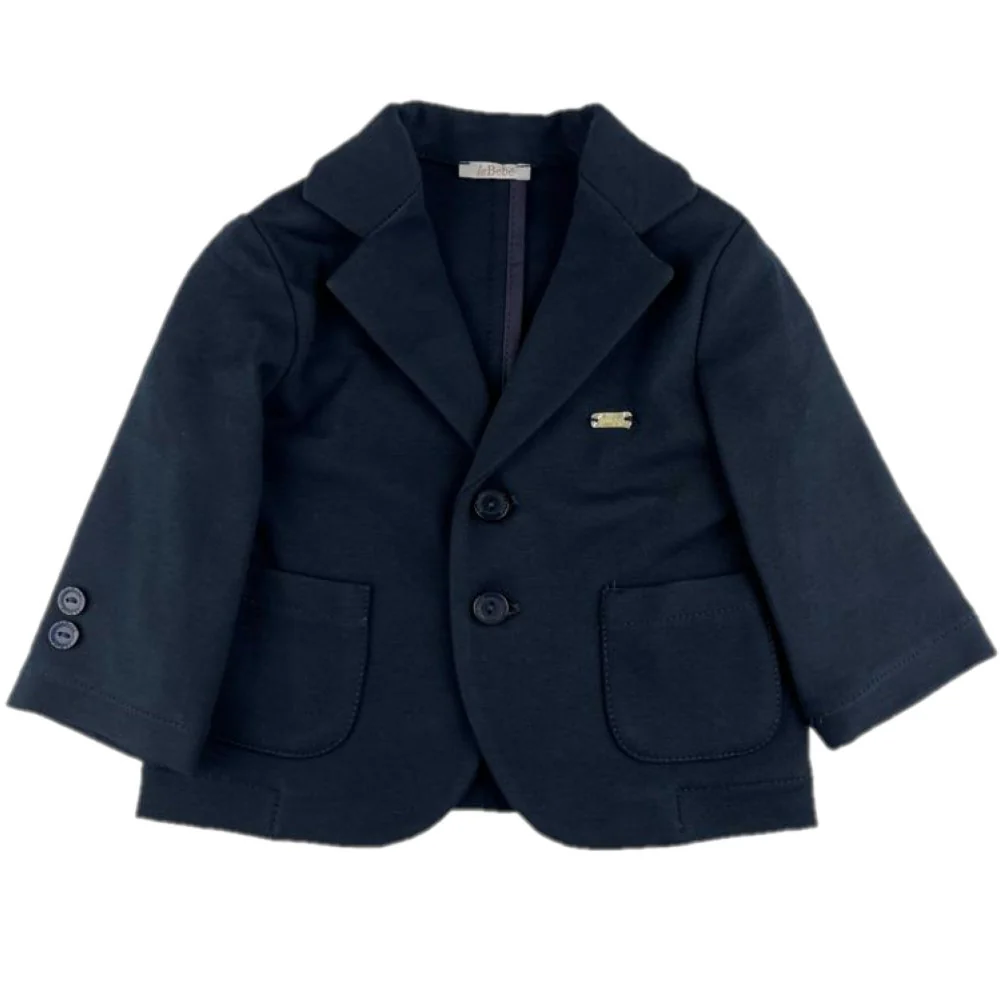 Giacca LE BEBE’ neonato in viscosa con chiusura bottoni lotati taschini applicati logo a rilievo rifinitura cuciture a vista tinta su tinta.