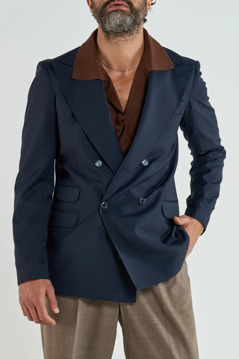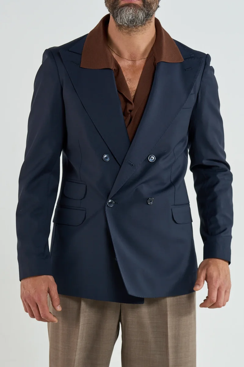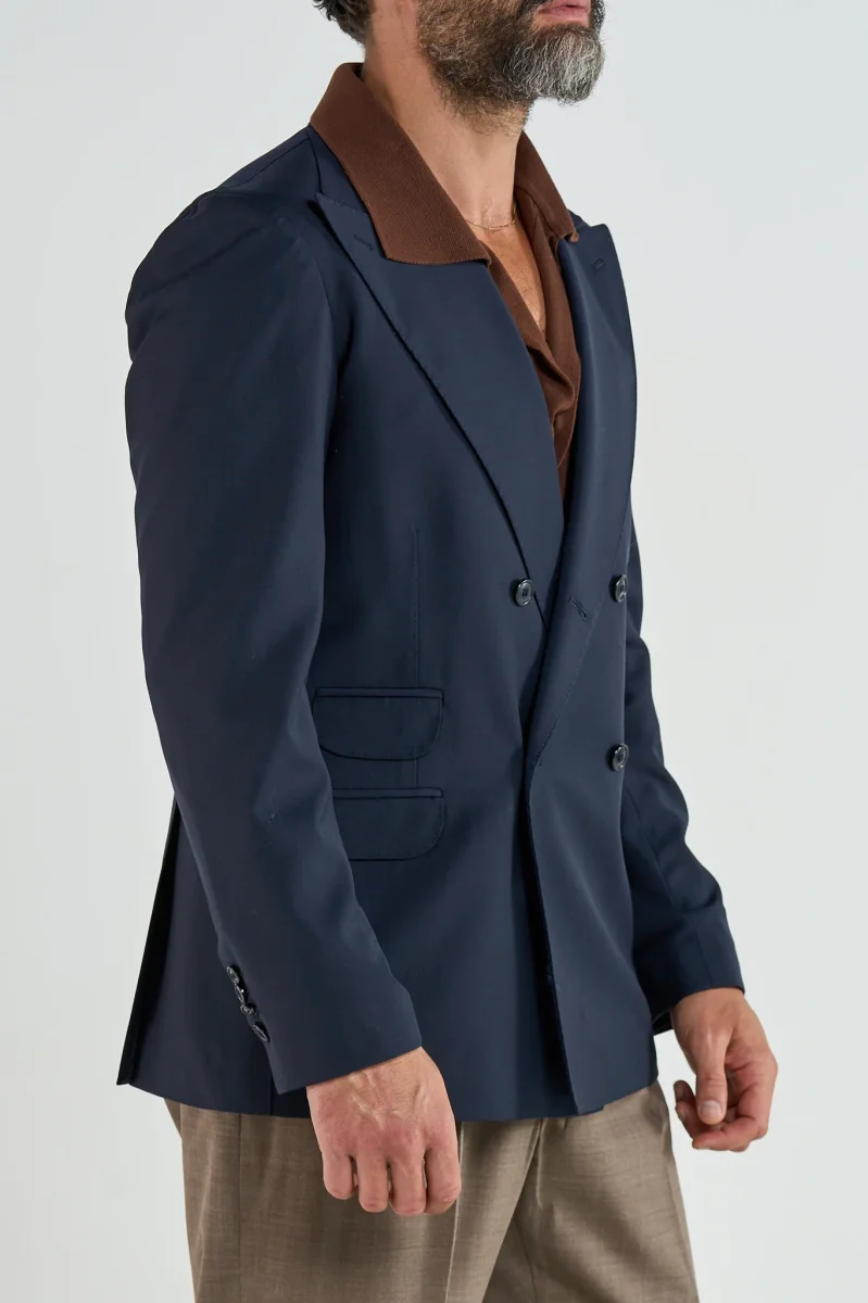 Giacca doppio petto quattro bottoni madre perla in tinta, revers a lancia impunturato, doppio taschino con pattina, doppio spacco sul retro.