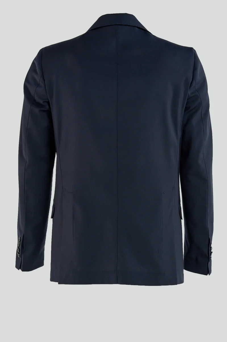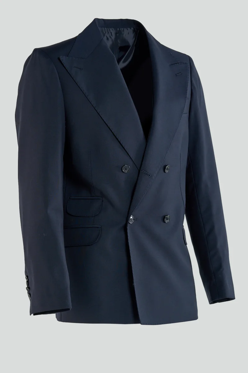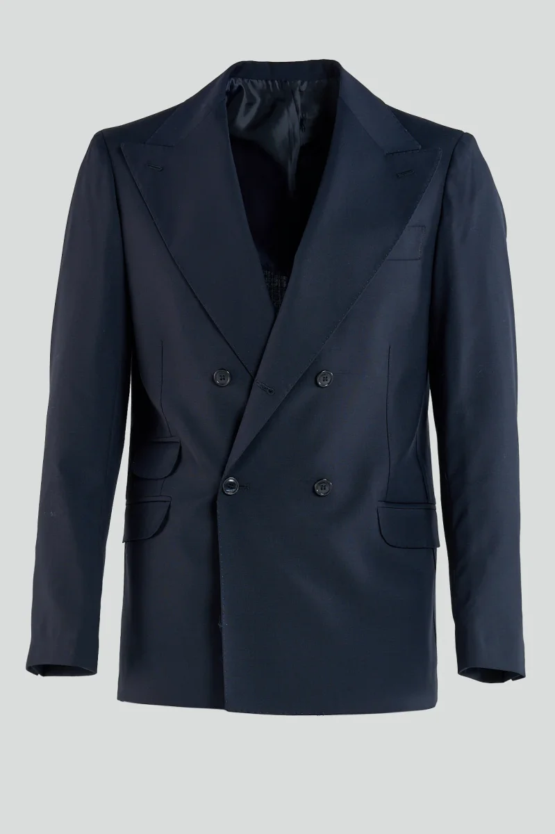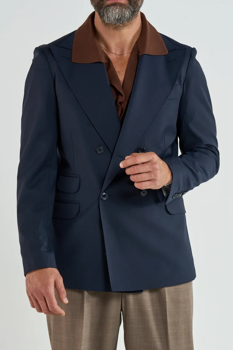 Giacca doppio petto quattro bottoni madre perla in tinta, revers a lancia impunturato, doppio taschino con pattina, doppio spacco sul retro.