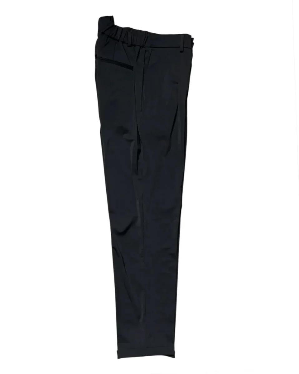 Pantalone in particolare tessuto NO STIRO. Cinturino con passanti, elastico sulla schiena e fisso sul davanti. Chiusura con zip e bottone, pences in vita, tasche a filo laterali. Gamba comoda e fondo slim, piega con risvolto. Vestibilità regolare. Composizione tessuto 75% poliammide, 25% elastan.