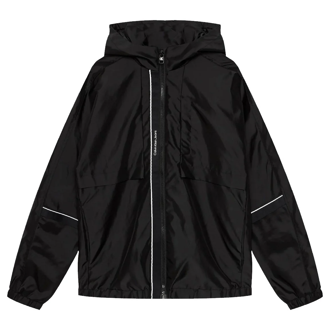 Giubbotto CALVIN KLEIN in tessuto tecnico, modello antivento con cappuccio, chiusura zip , inserto in tessuto a contrasto con logo stampato , tasche laterali e tasca a scomparsa sulla parte superiore con chiusura clips ,inserto elastico ai polsini e in vita .