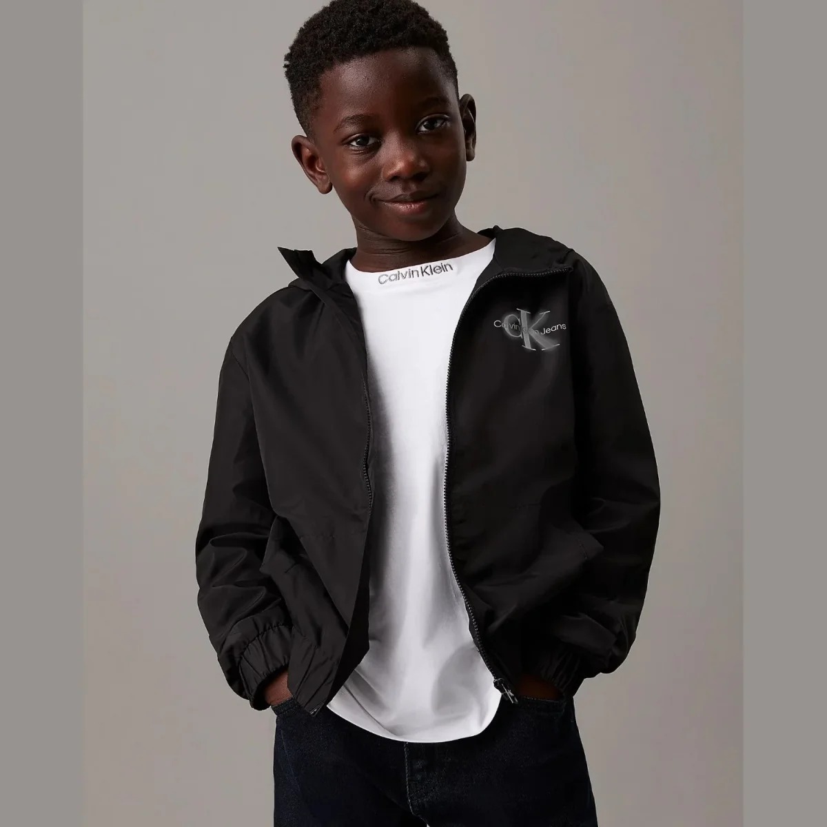 Giubbotto CALVIN KLEIN modello estivo con cappuccio, chiusura con zip e logo grigio.