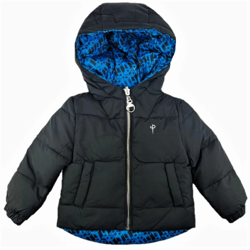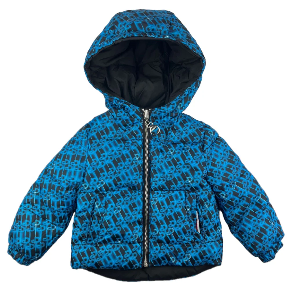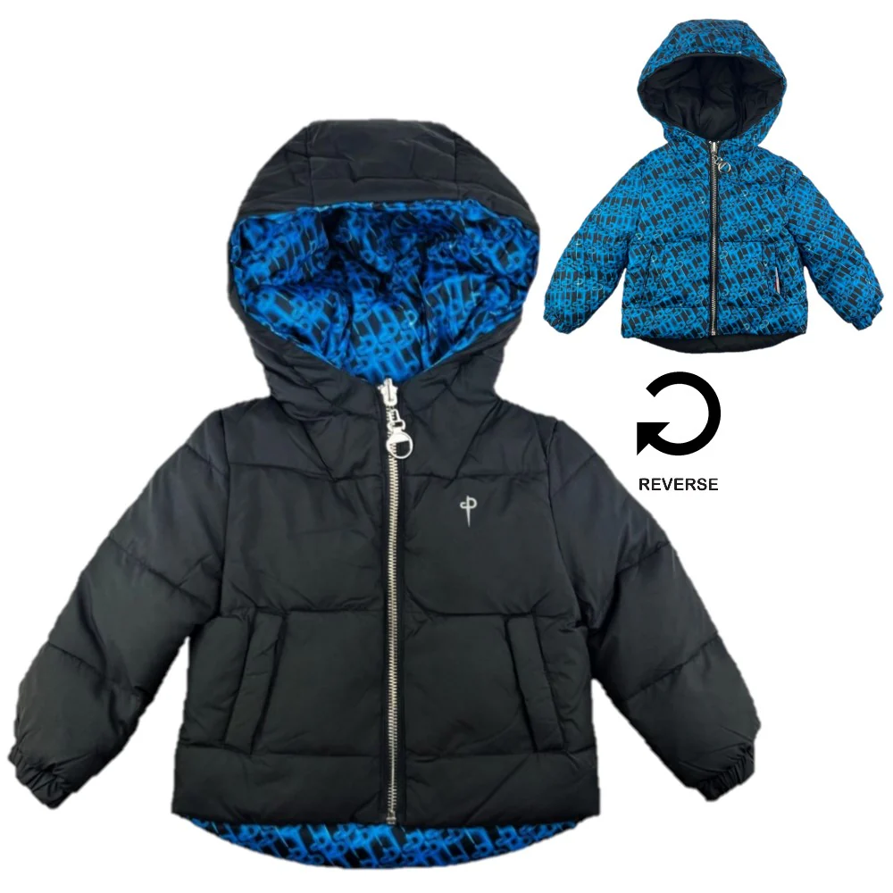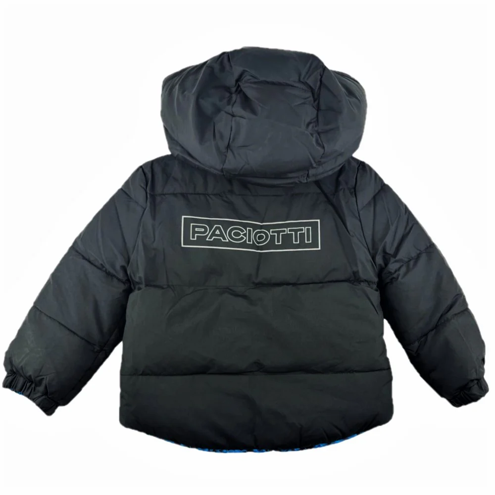 Giubbotto CESARE PACIOTTI con cappuccio modello reversibile da un lato tinta unita e dall’altro fantasia logata tasche laterali con chiusura clips chiusura con zip con cursore logato.