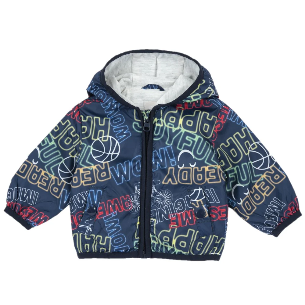 Giubbotto CHICCO in tessuto tecnico a fantasia a contrasto con cappuccio chiusura con zip tasche laterali con chiusura clips fodera interna in cotone.