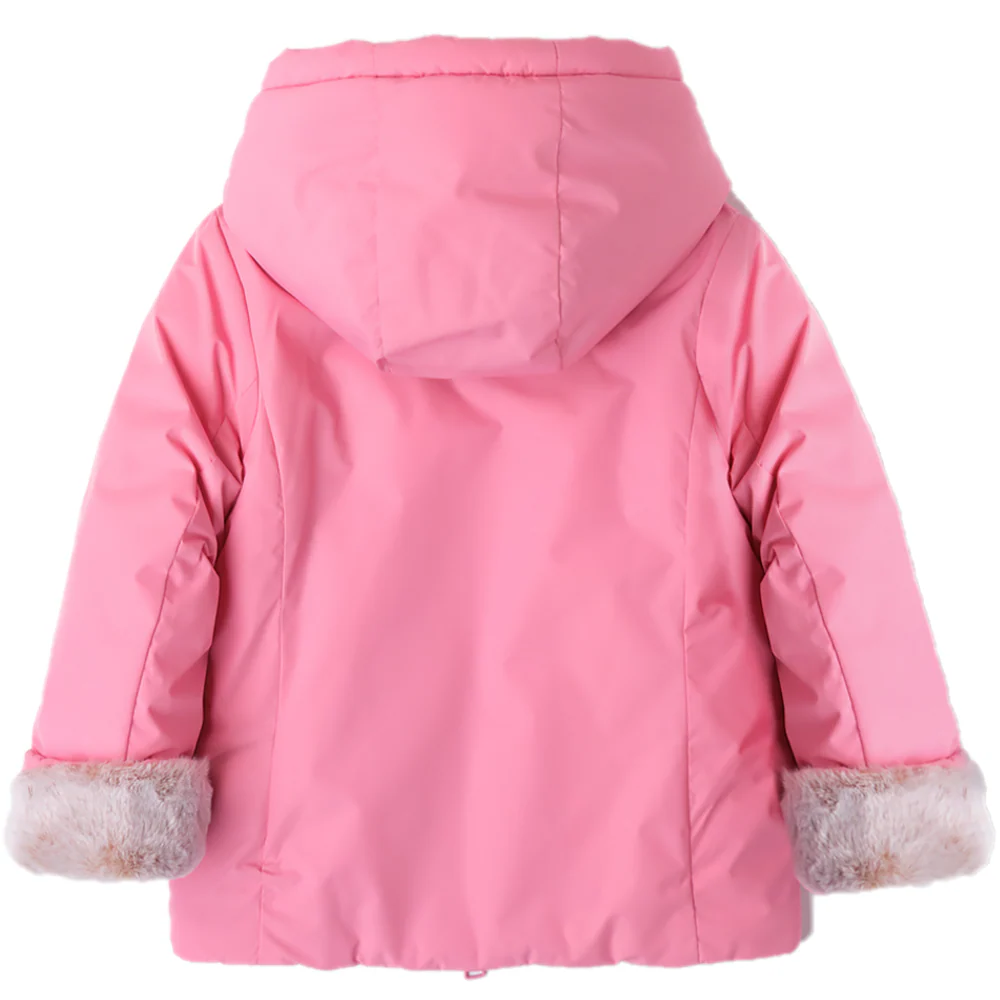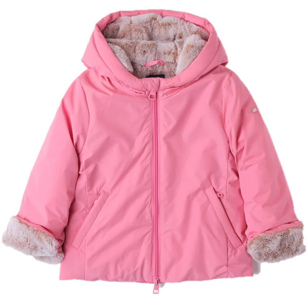 Giubbotto bambina i DO modelli con cappuccio, rifiniture al cappuccio, alle maniche e interne in ecopelliccia, chiusura zip intera.