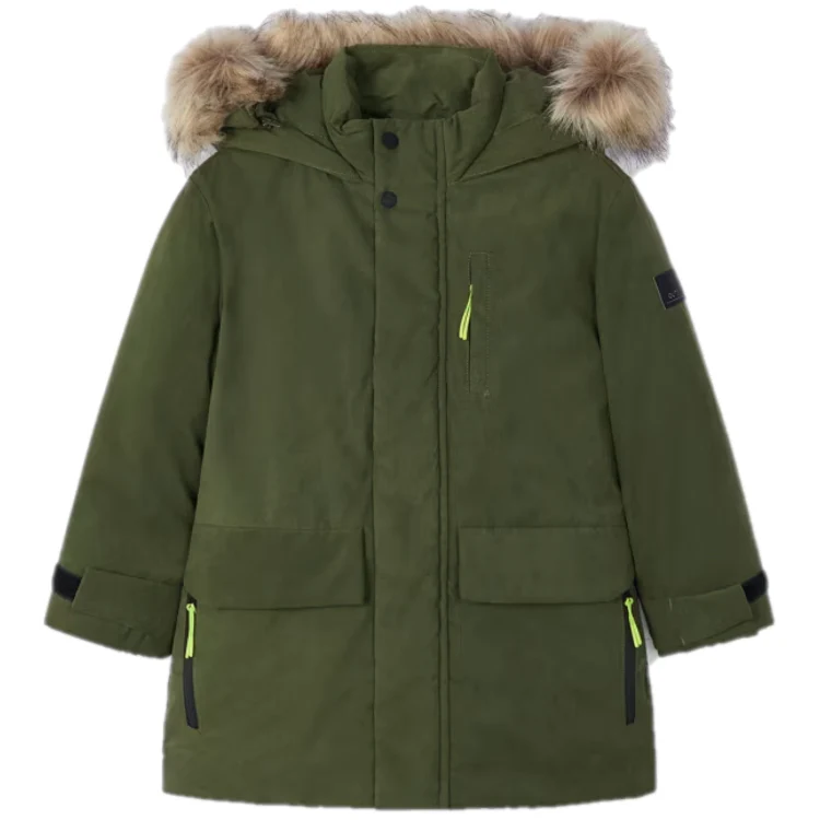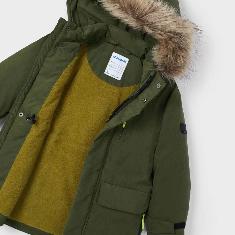 Giubbotto bambino MAYORAL modello parka chiusura con zip, ecopelliccia removibile al cappuccio. interno in ecopelliccia, nella taglia 2anni e 3anni l’ecopelliccia è a pelo corto e di colore beige.
