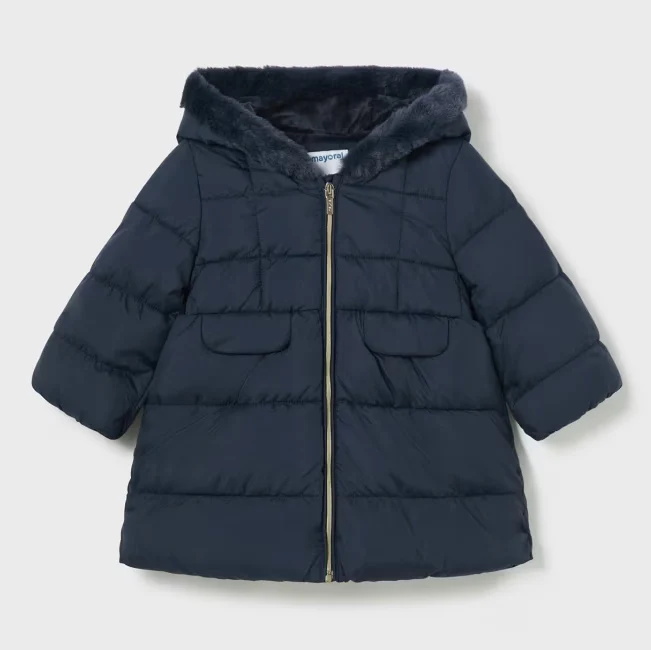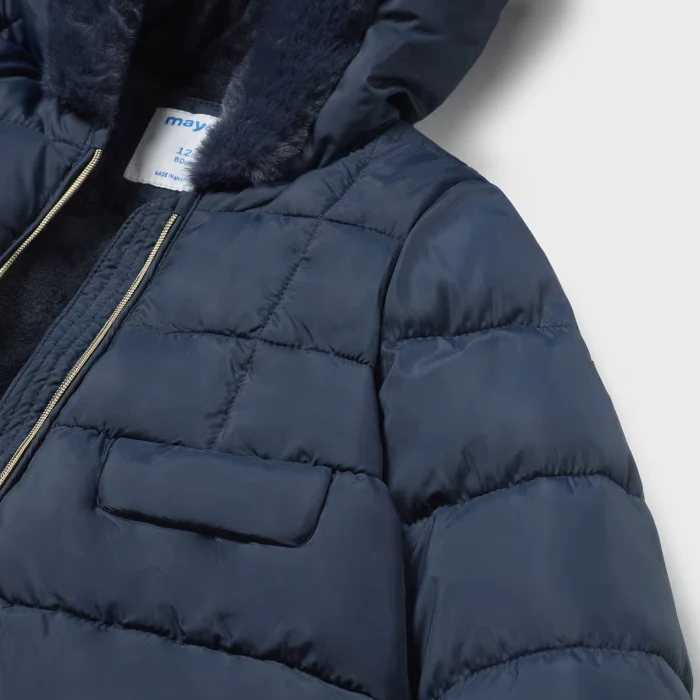 Giubbotto bambina MAYORAL zip intera, modello con cappuccio e bordatura in ecopelliccia.