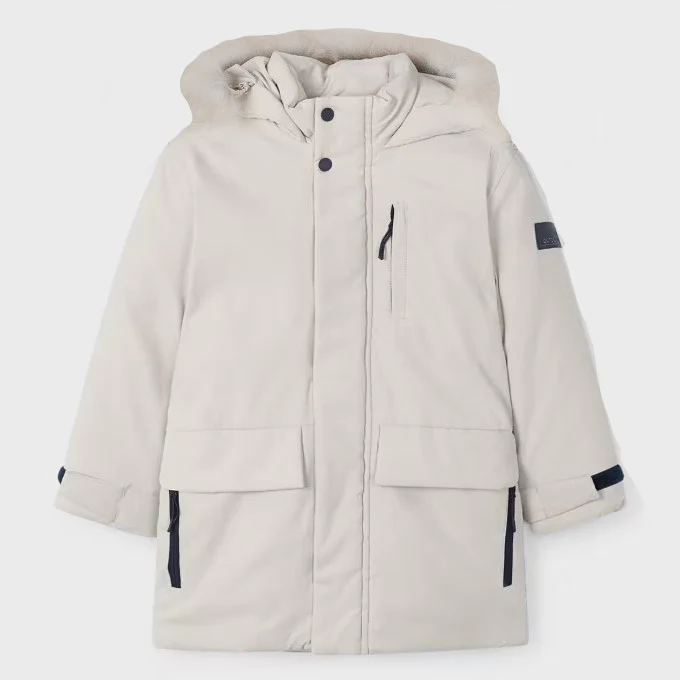 Giubbotto bambino MAYORAL modello parka chiusura con zip, ecopelliccia removibile al cappuccio. interno in ecopelliccia, nella taglia 2anni e 3anni l’ecopelliccia è a pelo corto e di colore in tinta al giubbotto.