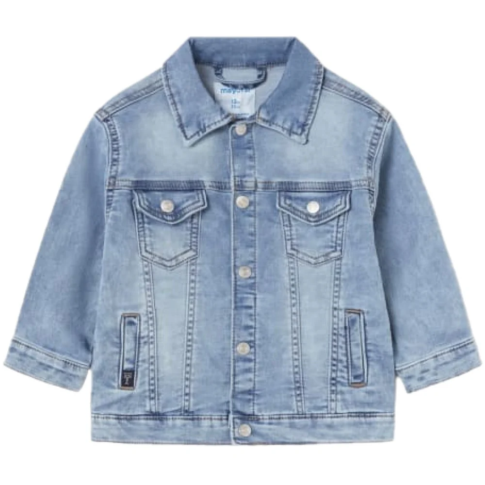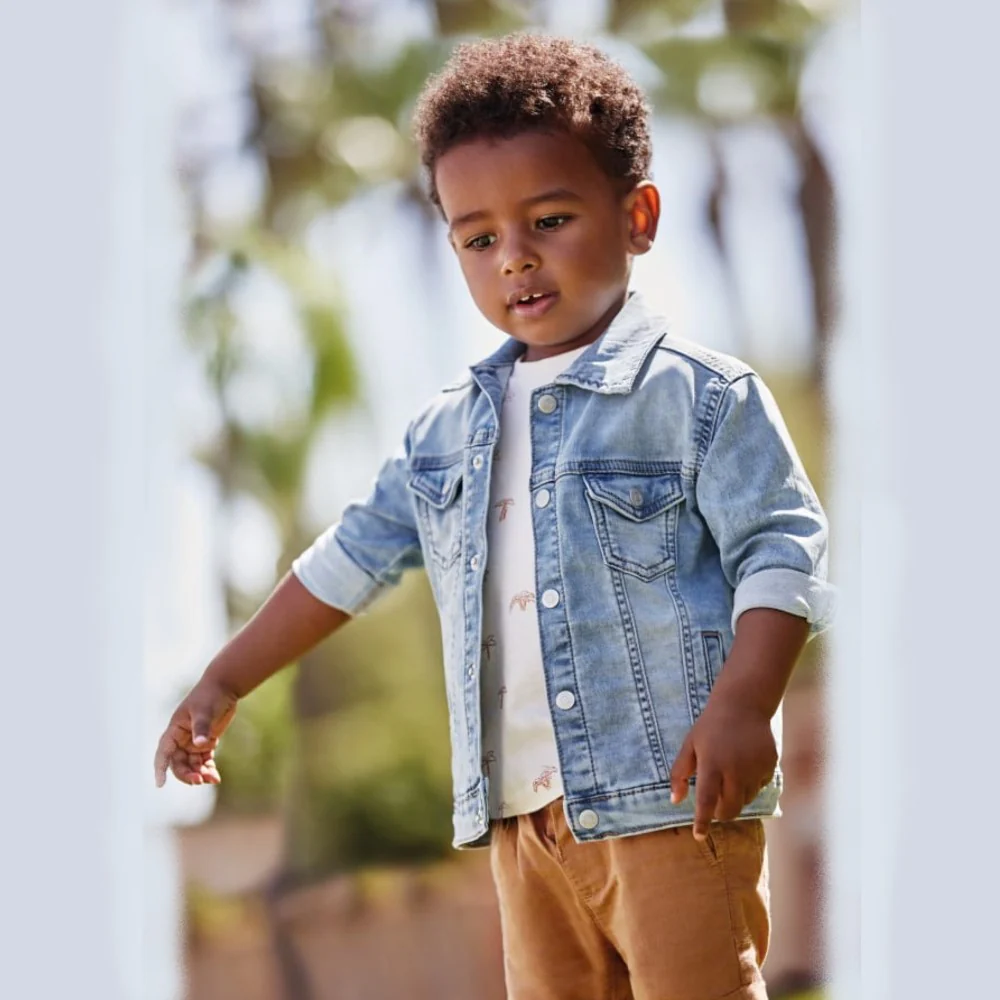 Giubbotto MAYORAL in jeans effetto vintage con chiusura clips logata rifiniture a contrasto taschini laterali e frontali applicati.Composizione