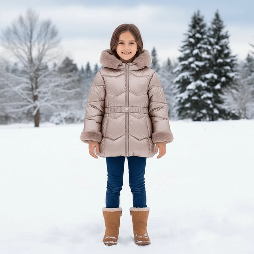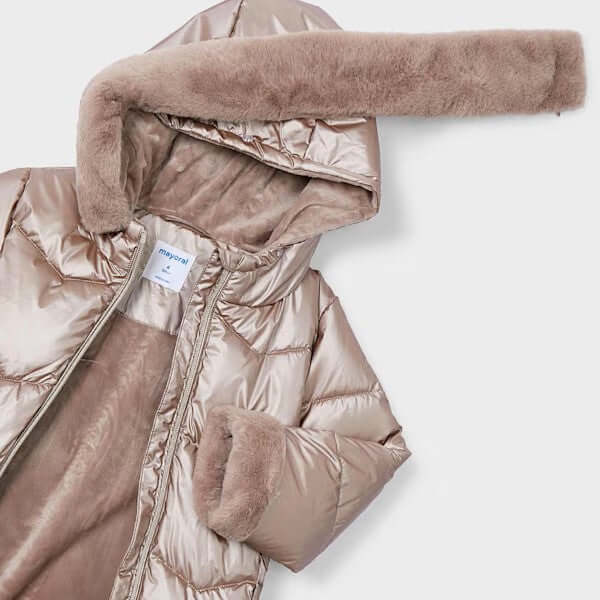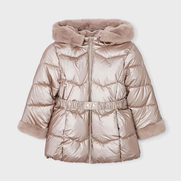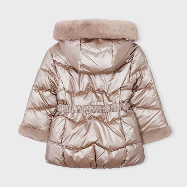 Giubbotto MAYORAL con cintura ed ecopelliccia ai polsi e al cappuccio. Ecopelliccia removibile dal cappuccio . Cintura in vita.