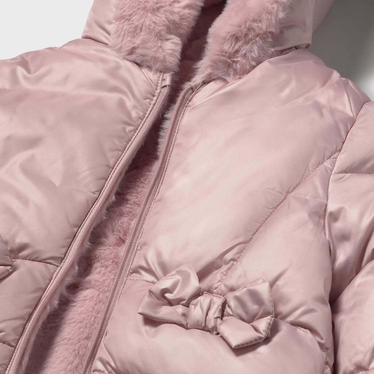 Giubbotto MAYORAL reversibile rosa , un lato in tessuto impermeabile e l’altro lato in ecopelliccia.