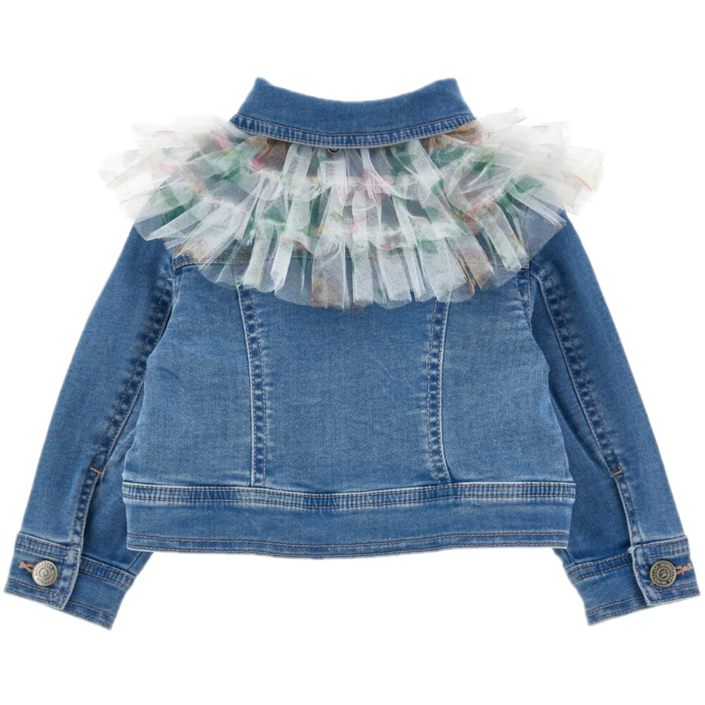 Giubbotto MONNALISA in jeans con mantellina in tulle a fantasia applicata su spalle mediante clips taschini applicati chiusura con bottoni logati ricami applicati sul colletto logo ricamato applicato.