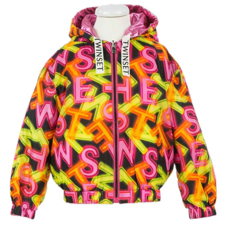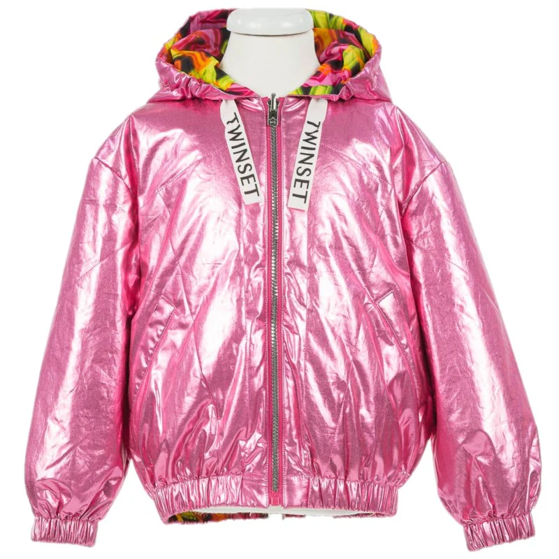 Giubbotto TWINSET modello primavera estate reversibile.Da un lato a fantasia multicolor dall’altro in colorazione metallizzata.fascette con lohi modello con cappuccio e chiusura zip intera.