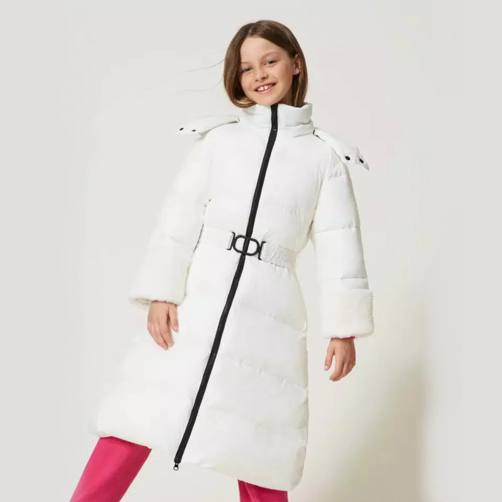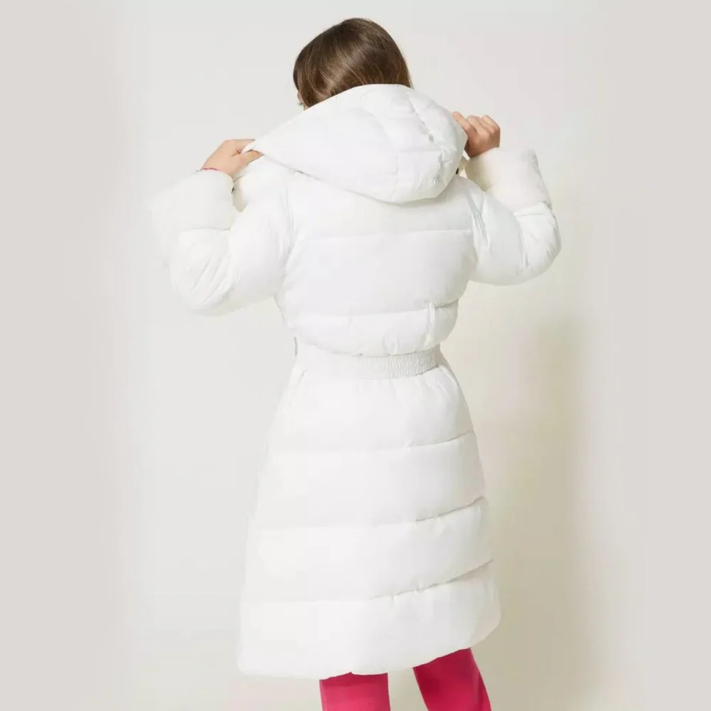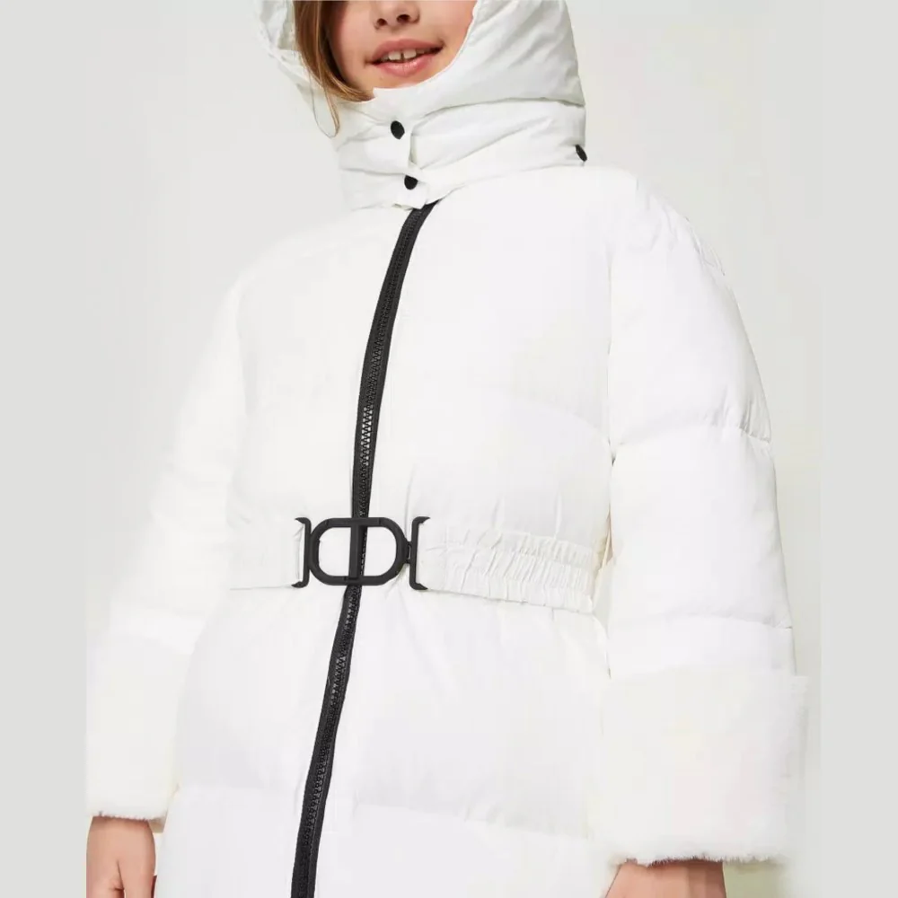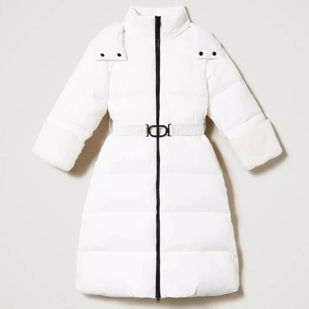 Giubbotto TWINSET modello piumino lungo in tessuto tecnico con cappuccio rimovibile mediante clips polsini in ecopelliccia chiusura zip con doppio cursore e tasche laterali cintura coordinata con fibbia logata.
