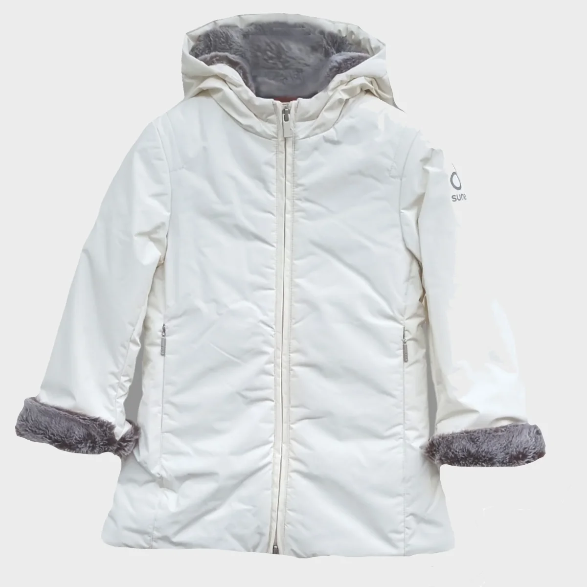 Giubbotto SUNS BOARDS modello parka con cappuccio , foderato in ecopelliccia, chiusura con zip ,tasche laterali con chiusura zip , logo sulla manica.