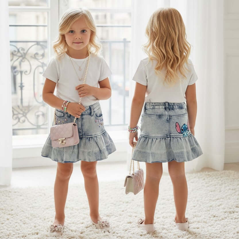 Gonna Monnalisa tema stitch in jeans , strass applicati avanti , ricamo con Stitch sul retro.