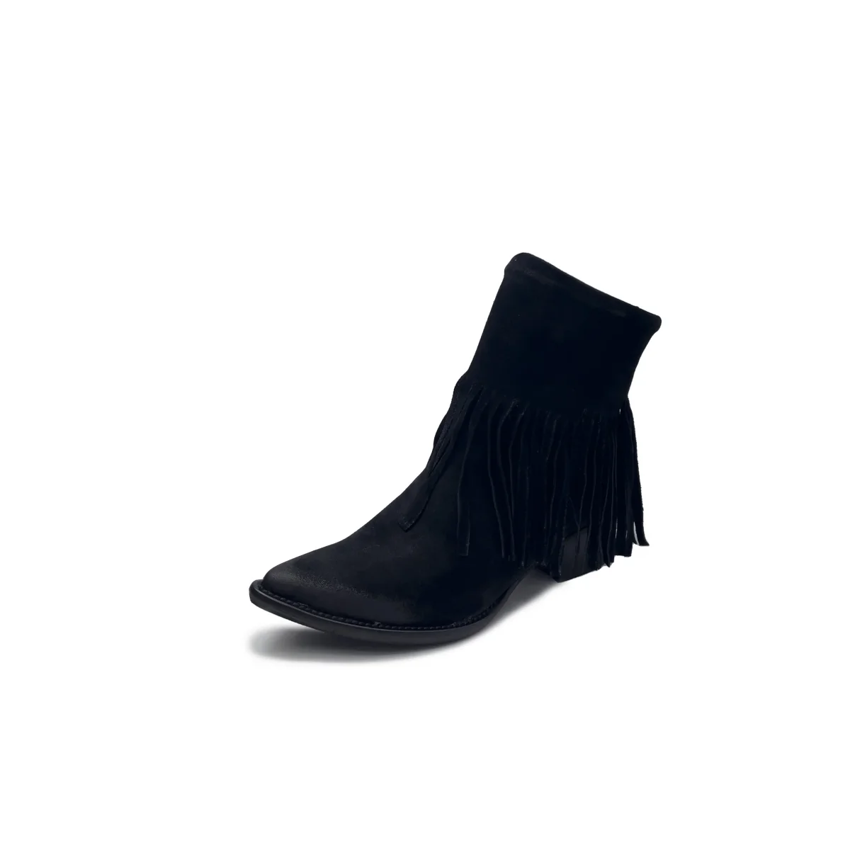 Questi eleganti stivali Texano da donna in camoscio nero con punta tonda e frange sono perfetti per conferire uno stile raffinato e alla moda. Ideali per qualsiasi occasione, garantiscono un look unico e confortevole grazie alla loro forma a punta e alla presenza di frange.