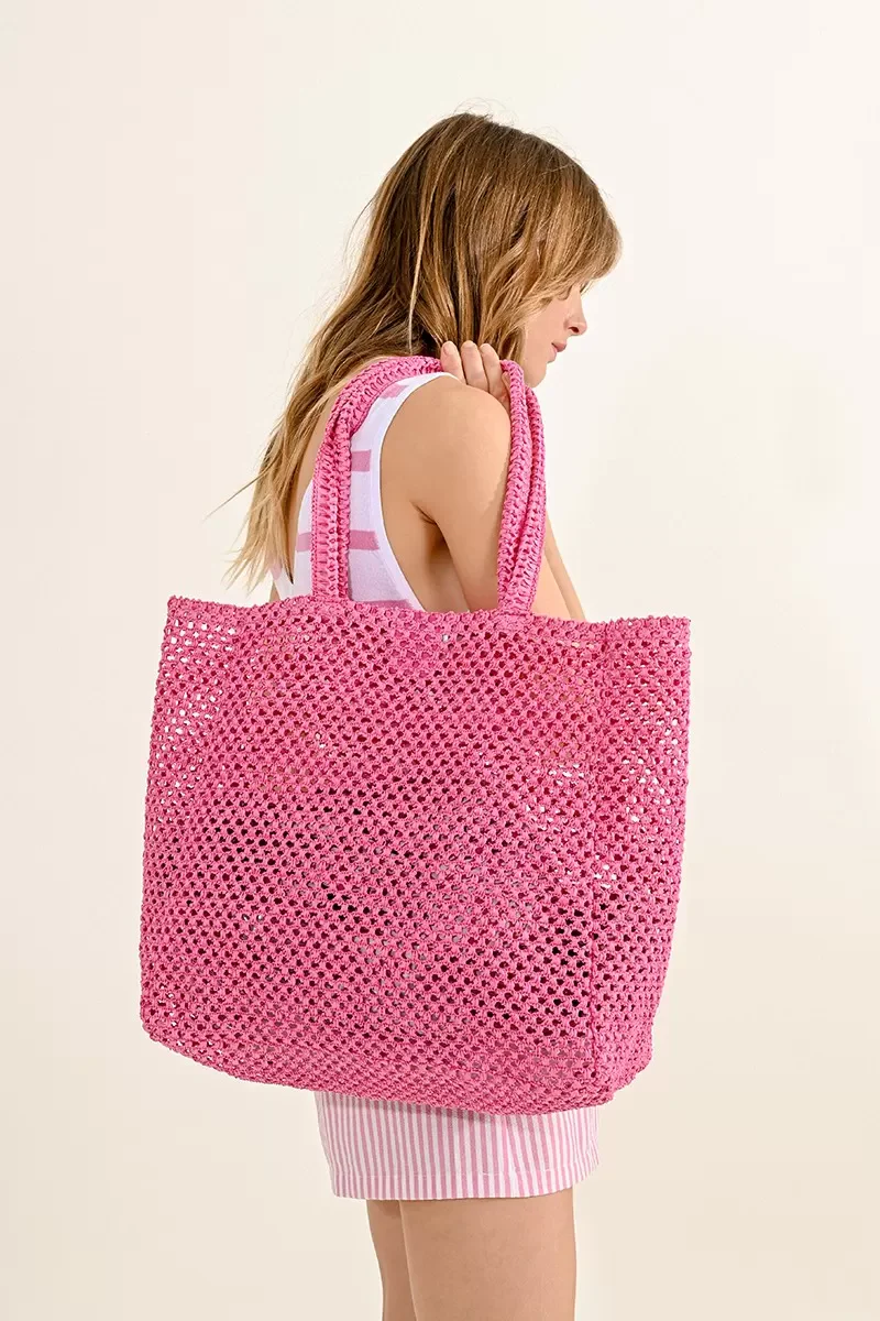 Ampia borsa da mare/tempo libero in tessuto juta intrecciata. Forma shopper classica, manici lunghi. Misure 41×49 cm. Composizione tessuto 100% carta.