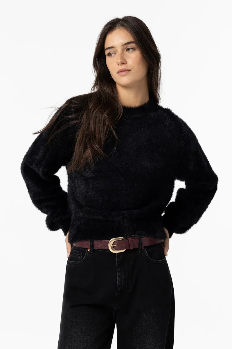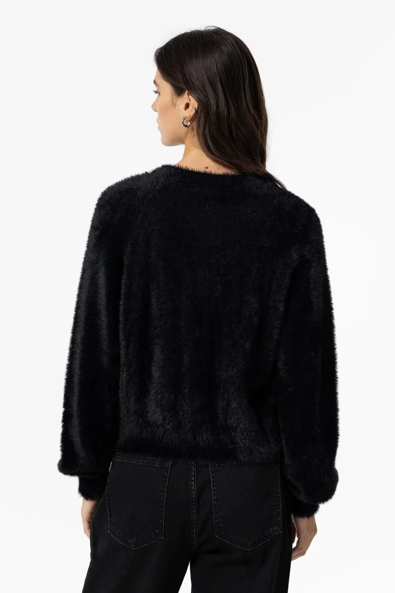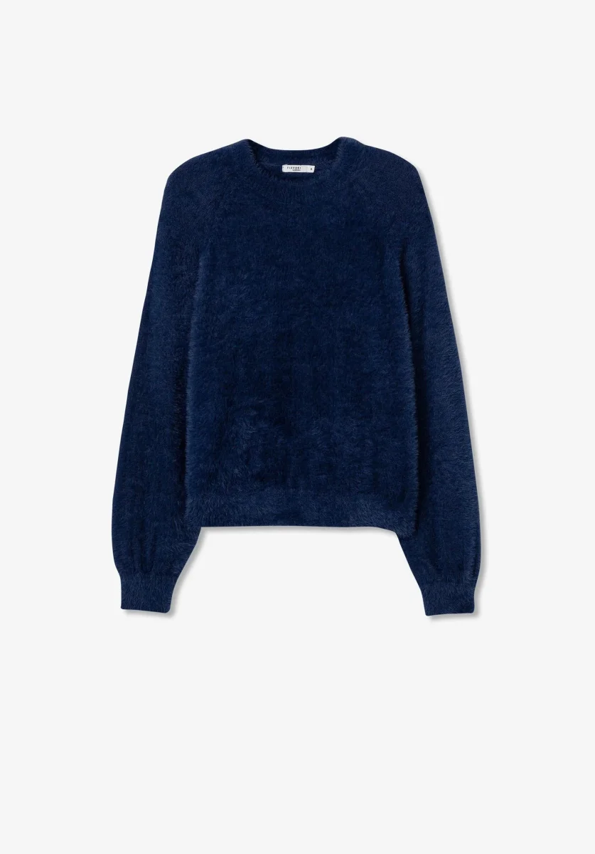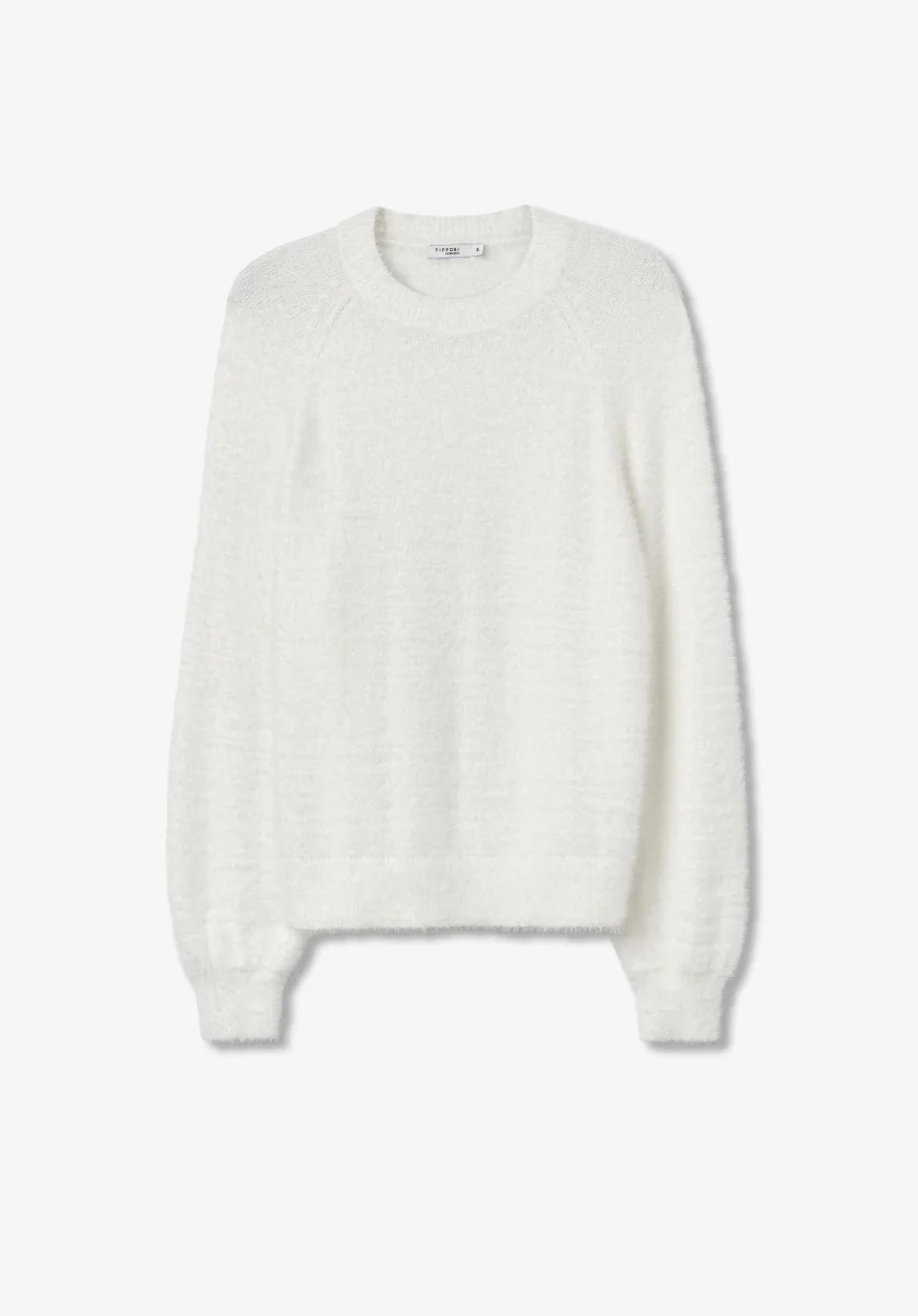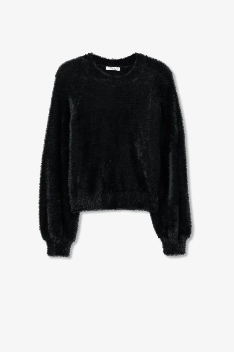 Maglia crop in tessuto effetto peluche. Scollo tondo, maniche lunghe con polsini a palloncino. Vestibilità regolare. Tessuto 100% poliammide.