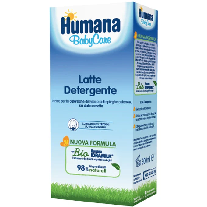 Latte detergente ideale per la detersione del viso e delle pieghe cutanee sin dalla nascita.Deterge delicatamente la cute lasciandola morbida e idratata.Questo prodotto è realizzato con il 98% di ingredienti di origine naturale.L&rsquoelevata naturalità della formula può comportare variazioni di colore che non alterano la qualità del prodotto.Il restante 2% è composto da ingredienti che aiutano a conservare il prodotto e a migliorarne l&rsquoesperienza di utilizzo.Humana ha sviluppato la nuova linea per la detersione e protezione della pelle dei neonati e dei bambini ancora più specifica delicata e sicura.La nuova linea Humana Baby Care è arricchita con l&rsquoesclusivo Humana Bio Idramilk mix di latti vegetali biologici di avena mandorla e riso dalla comprovata proprietà idratante.Particolarmente adatto alla pelle dei più piccoli aiuta a preservare l&rsquoequilibrio idrolipidico e a mantenere la barriera cutanea integra.Clinicamente testato su pelli sensibili.Senza alcool parabeni e siliconi.