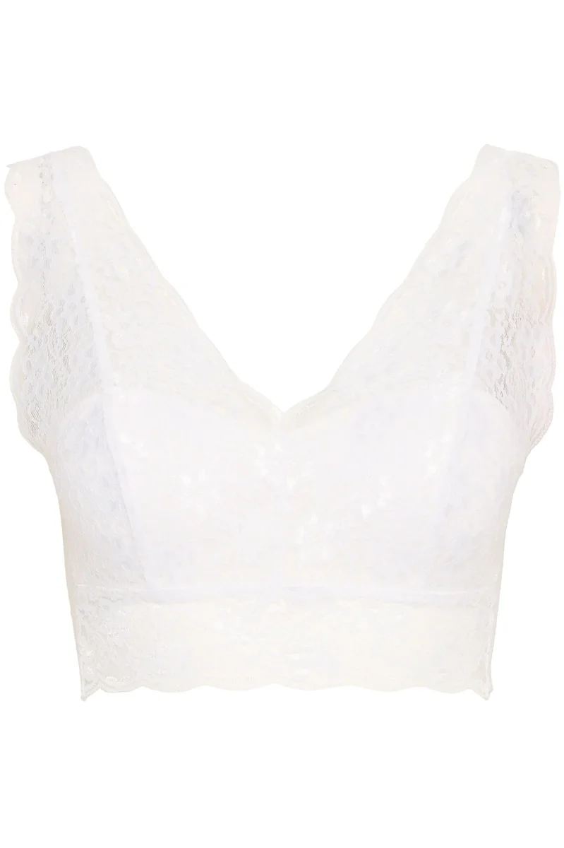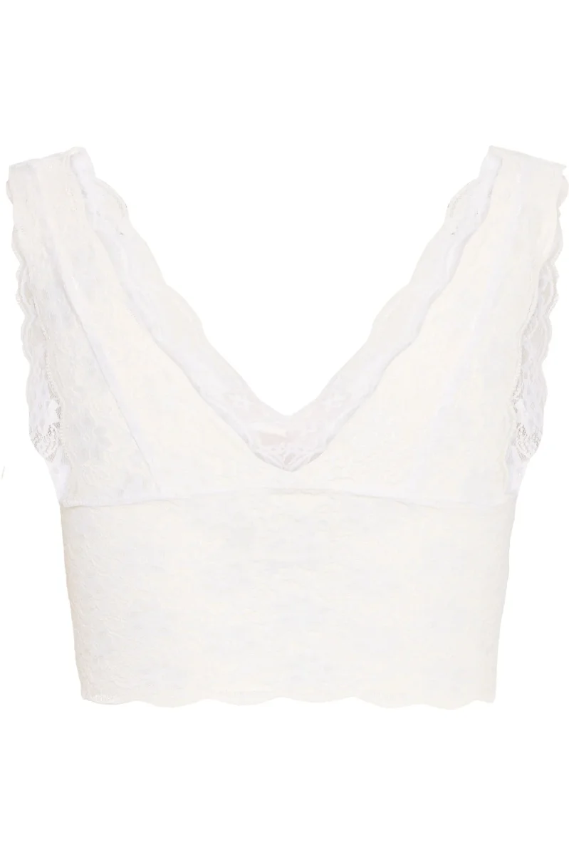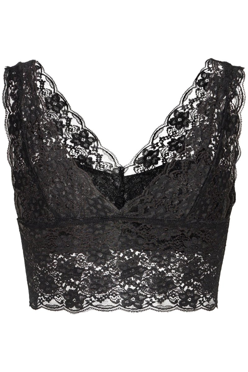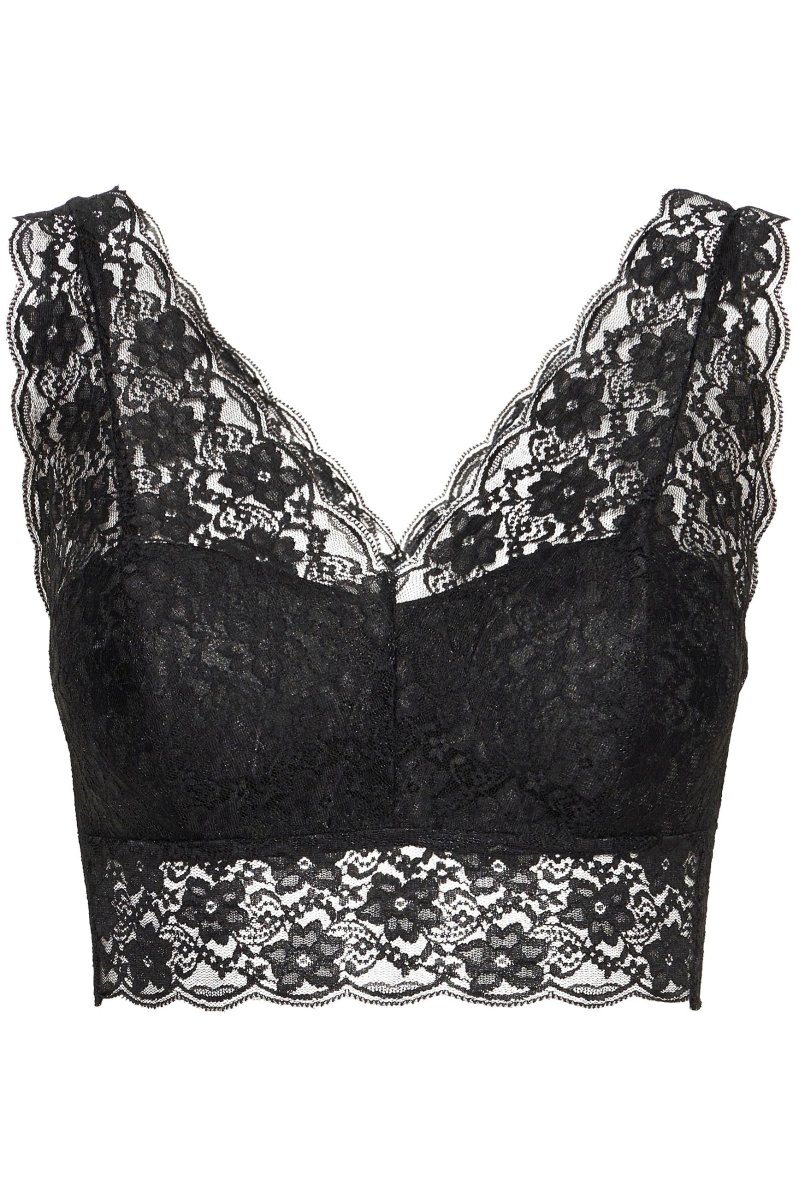 Top modello bralette in tessuto elasticizzato. Lavorazione del pizzo con fiori tono su tono, spalline larghe. Coppe cucite. Vestibilità regolare. Composizione tessuto 100% poliestere.
