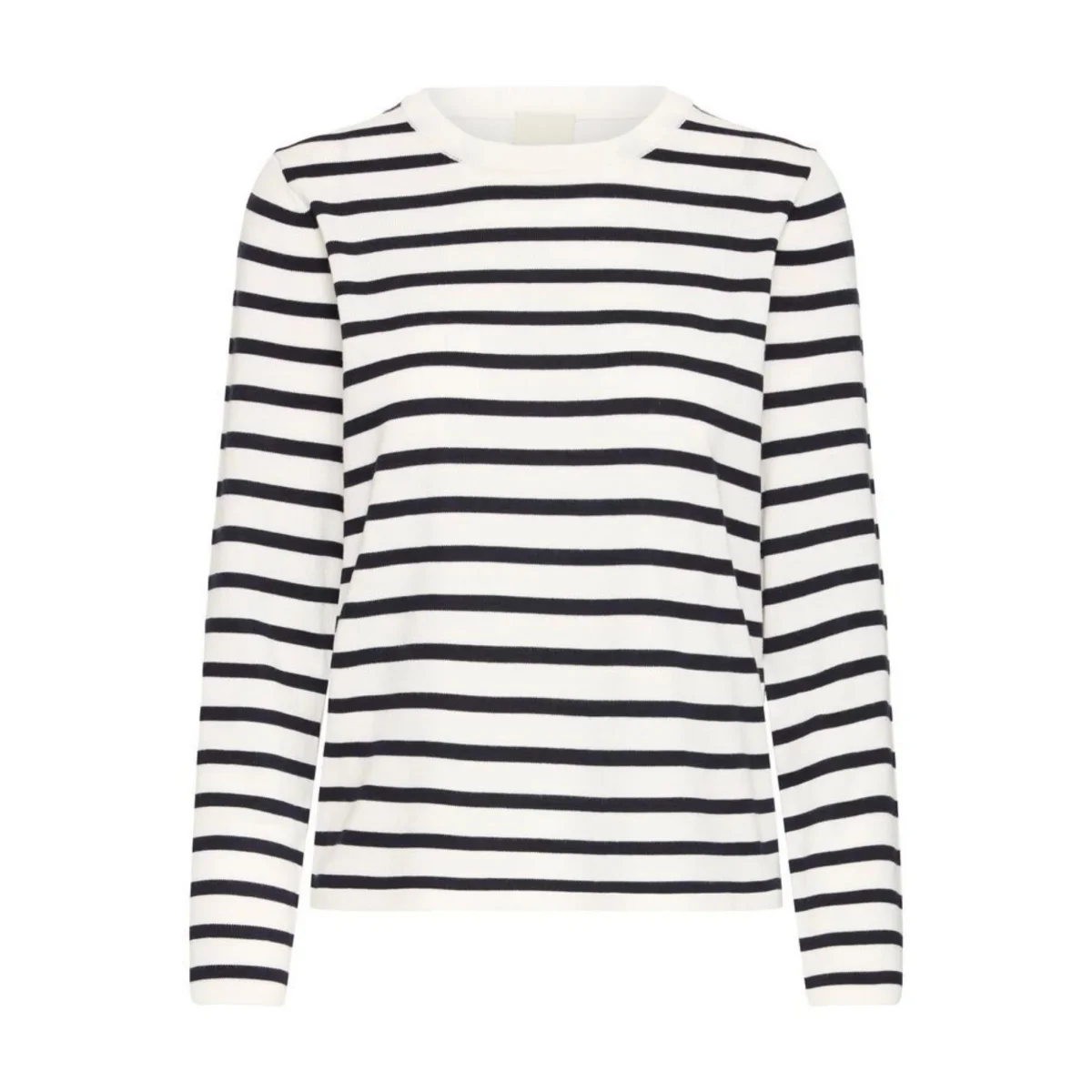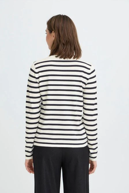 Maglia donna basic in tessuto misto viscosa primo peso. Girocollo con bordo liscio. Motivo a righe strette. Vestibilità dritta. Taglia in foto S. Composizione tessuto 80% viscosa 20% poliammide.