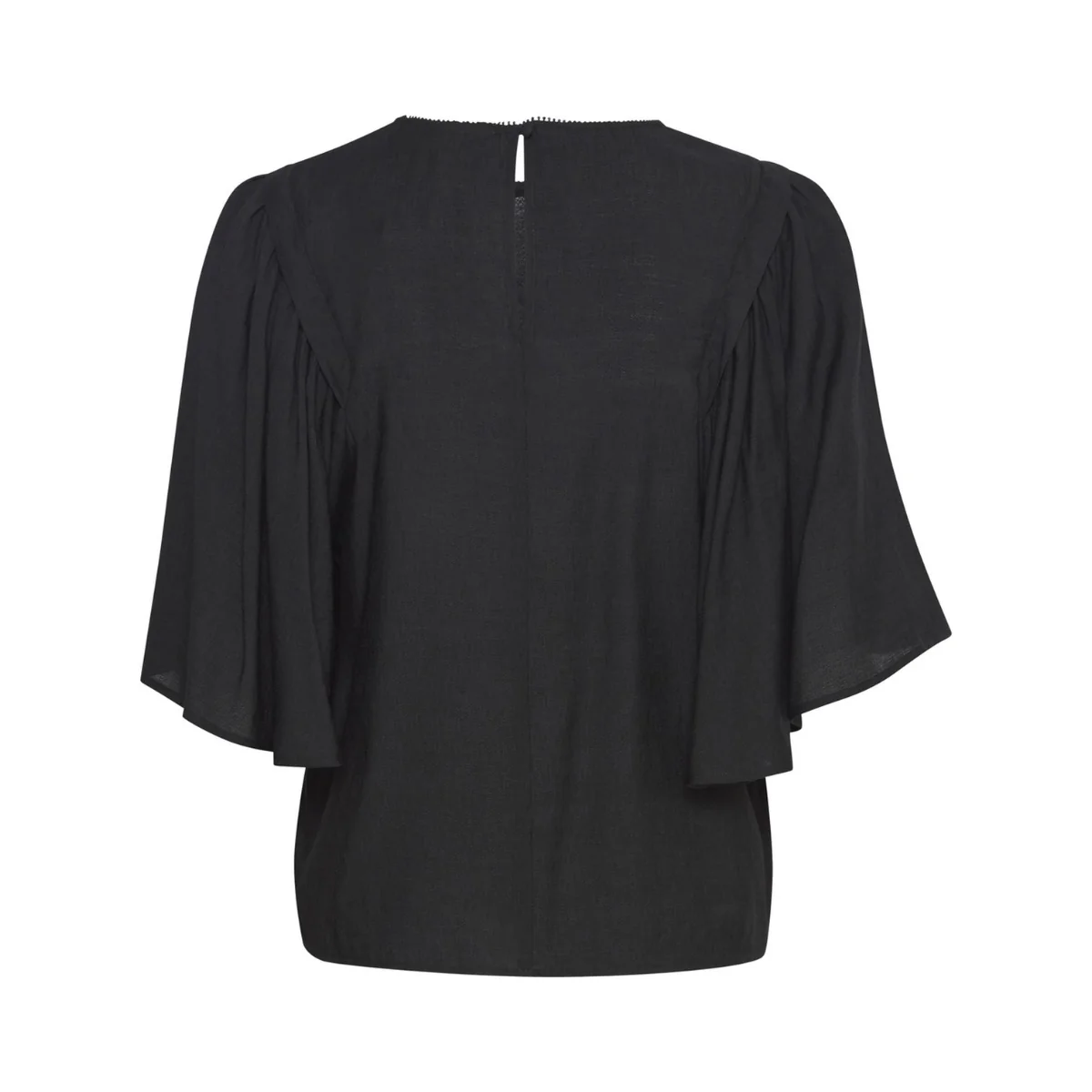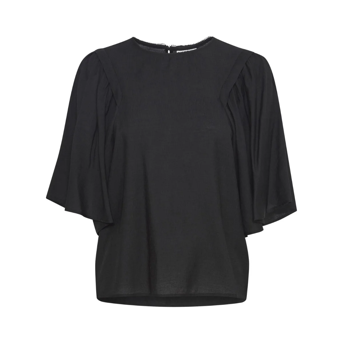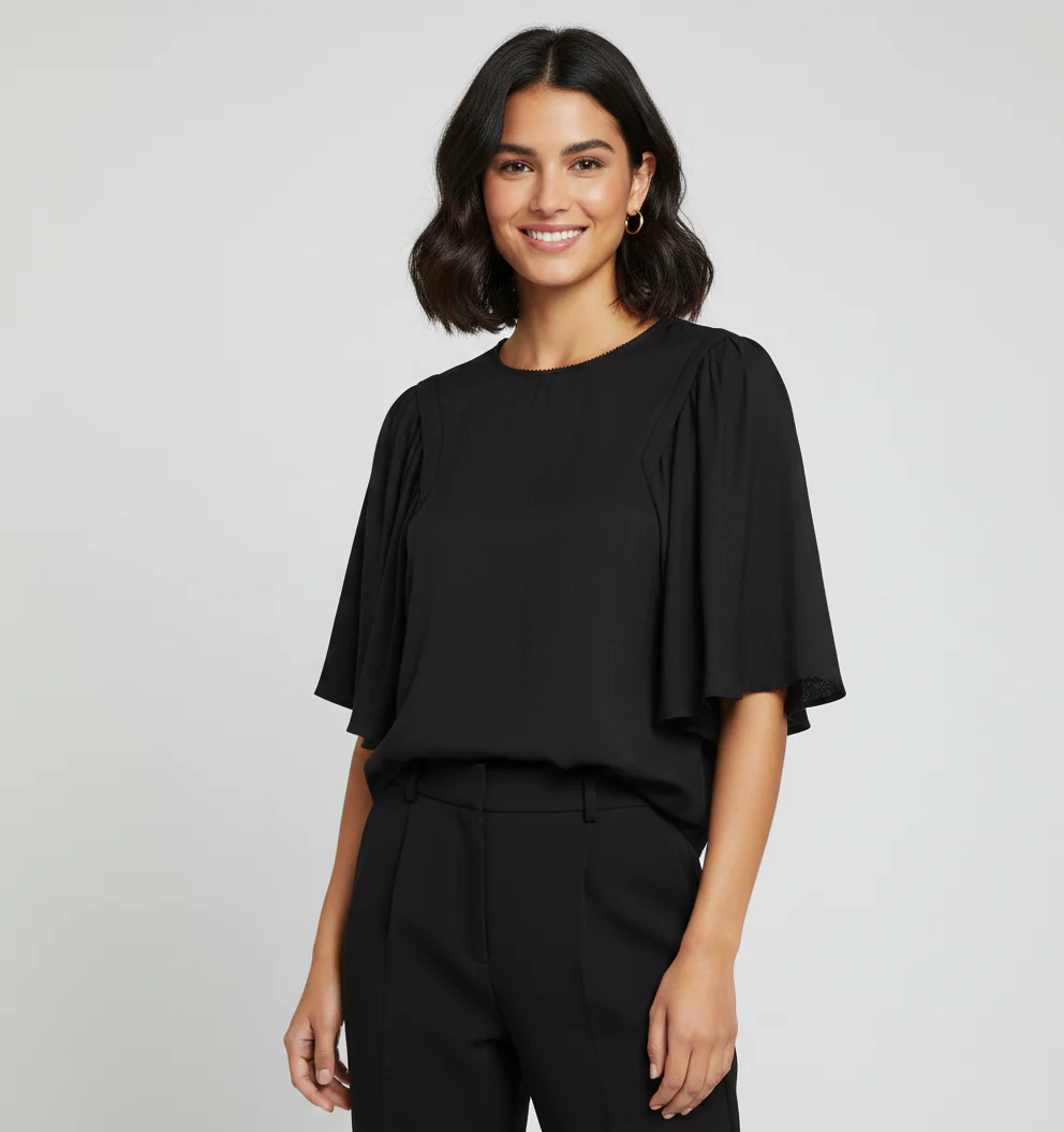 Casacca donna in tessuto misto viscosa. Scollo tondo con bordo rifinito, chiusura con bottone posteriore sul collo. Maniche 3/4 ampie, effetto a farfalla. Vestibilità dritta. Composizione tessuto 70% viscosa 30% poliammide.