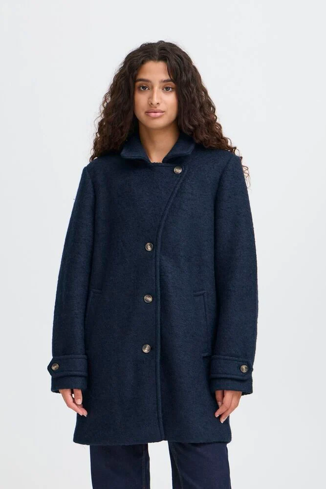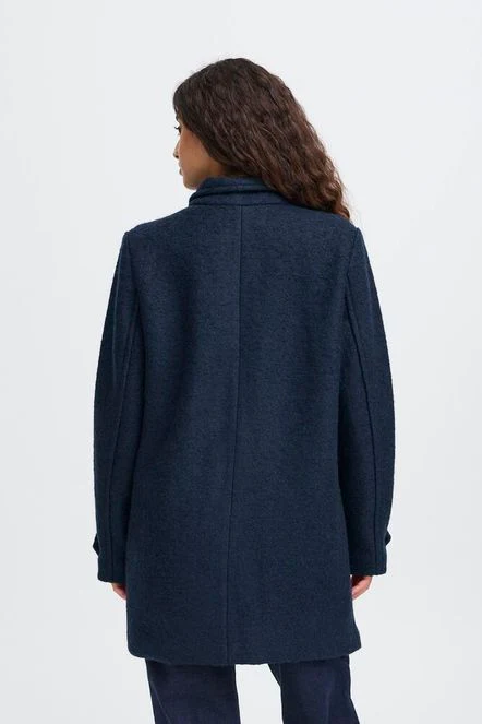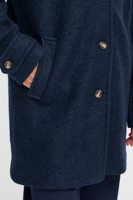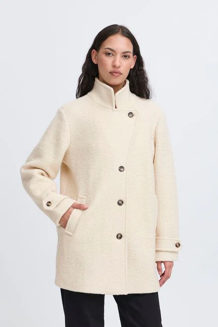 Cappotto donna in tessuto misto lana lavorazione bouclé. Colletto piccolo rigido, abbottonatura centrale con bottoni grandi e bottone laterali su spalla per bloccare il rever all’occorrenza. Maniche lunghe con mostrine applicate ai polsi. Tasche laterali, vestibilità over. Lunghezza a metà gamba. Taglia in foto 40 italiana. Le taglie mostrate corrispondono alla taglia italiana. Composizione tessuto 50% lana, 50% poliestere.