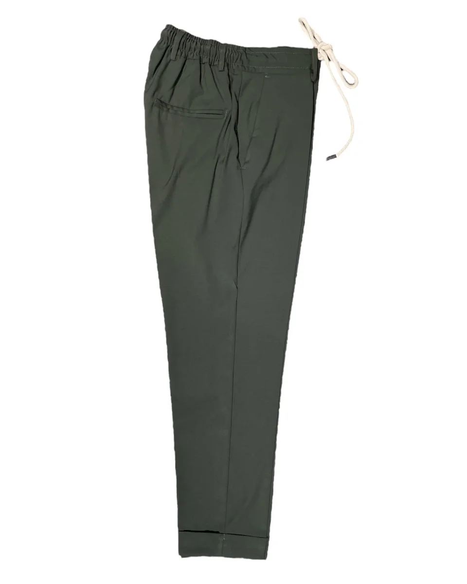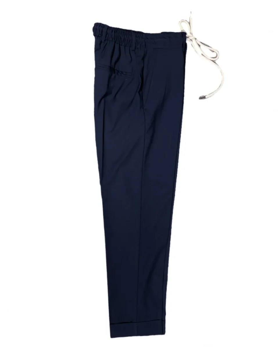 Pantalone modello pantalaccio in tessuto ultra leggero misto viscosa. Vita regolare con elastico sulla schiena e cinturino fisso sul davanti con coulisse in tessuto e chiusura con zip e bottone. Tasche a filo laterali, tasche a filetto posteriori. Gamba con piega stirata, vestibilità slim e fondo stretto con piega con risvolto. Lunghezza capri. Composizione tessuto 65% poliestere 30% viscosa 5% elastan.