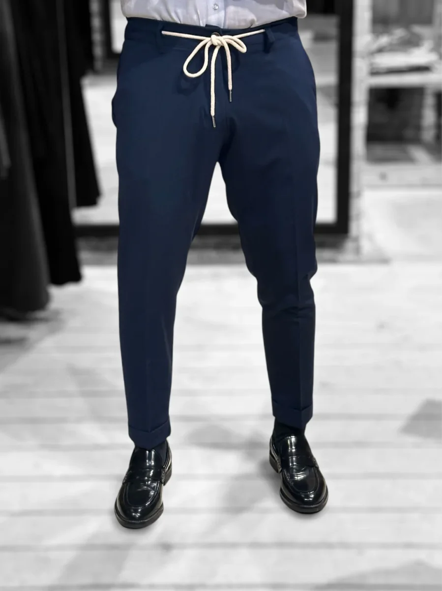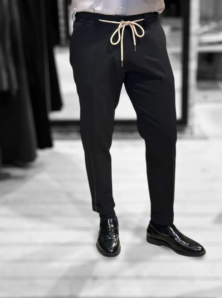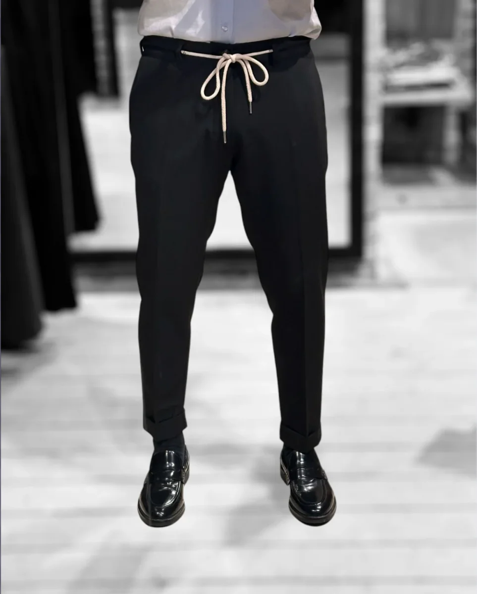 Pantalone modello pantalaccio in tessuto tecnico mano fredda. Vita regolare con elastico sulla schiena e cinturino fisso sul davanti con coulisse in tessuto e chiusura con zip e bottone. Tasche a filo laterali, tasche a filetto posteriori. Gamba con piega stirata, vestibilità slim e fondo stretto con piega con risvolto. Lunghezza capri. Composizione tessuto 75% poliestere 20% rayon 5% elastan.