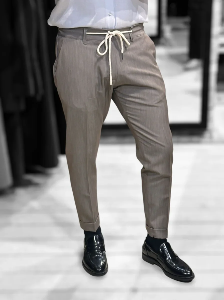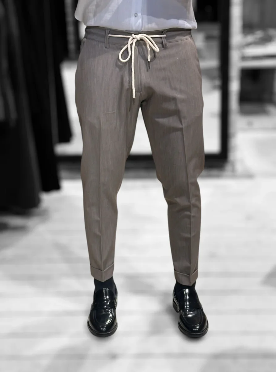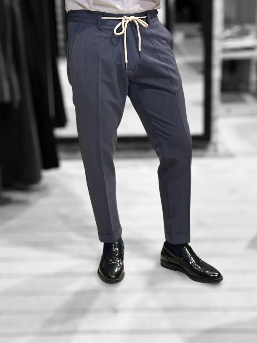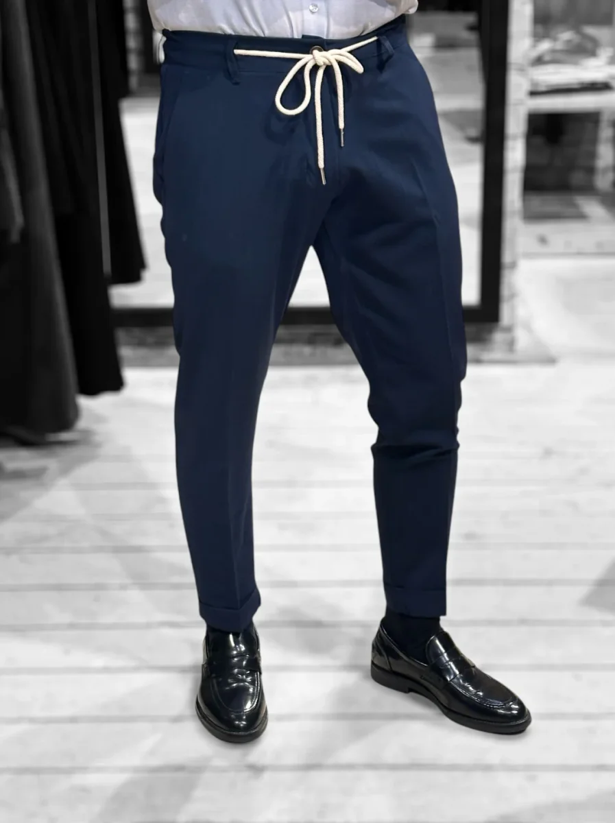 Pantalone modello pantalaccio in tessuto tecnico mano fredda. Vita regolare con elastico sulla schiena e cinturino fisso sul davanti con coulisse in tessuto e chiusura con zip e bottone. Tasche a filo laterali, tasche a filetto posteriori. Gamba con piega stirata, vestibilità slim e fondo stretto con piega con risvolto. Lunghezza capri. Composizione tessuto 75% poliestere 20% rayon 5% elastan.