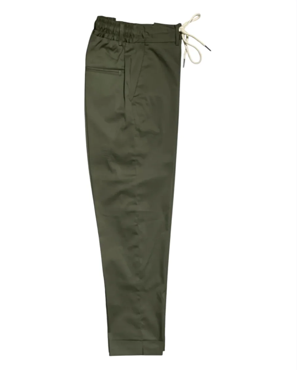 Pantalaccio in tessuto soft tech misto viscosa. Vita con cinturino fisso sul davanti ed elastico sulla schiena, coulisse cordino rimovibile. Pences in vita. Gamba dritta e fondo stretto con piega con risvolto. Vestibilità regolare. Composizione tessuto 63% poliestere 34% viscosa 3% elastan.