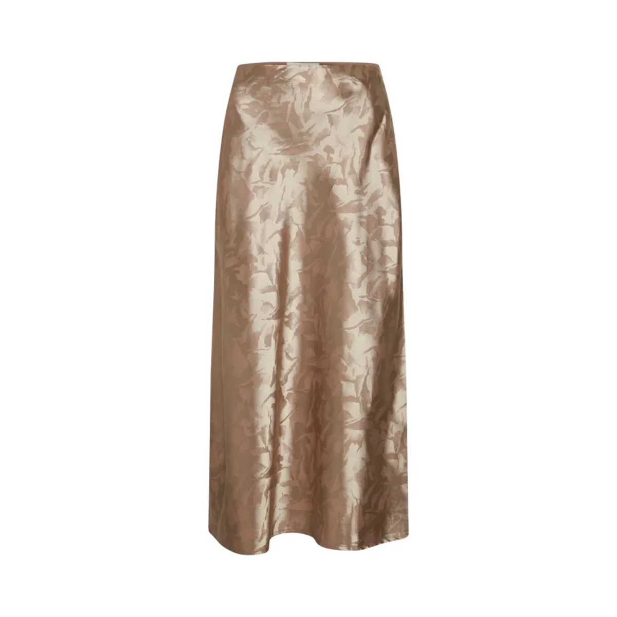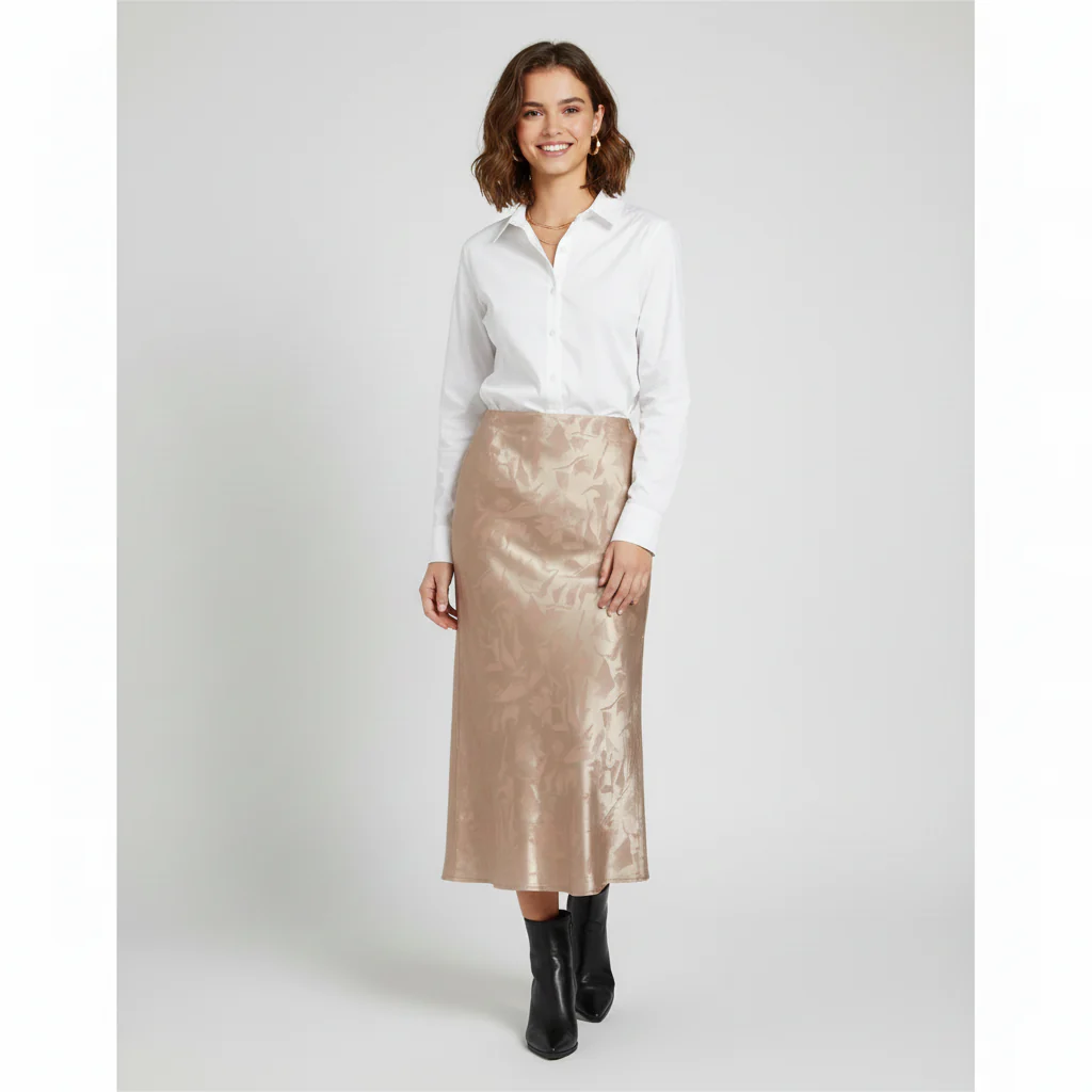 Gonna longuette in tessuto lucido rasato. Vita regolare, chiusura laterale con zip invisibile, bordo interno con fettuccia per sostenere la vita. Vestibilità dritta, lunghezza al polpaccio. Motivo jacquard tono su tono. Composizione tessuto 97% poliestere 3% elastan.