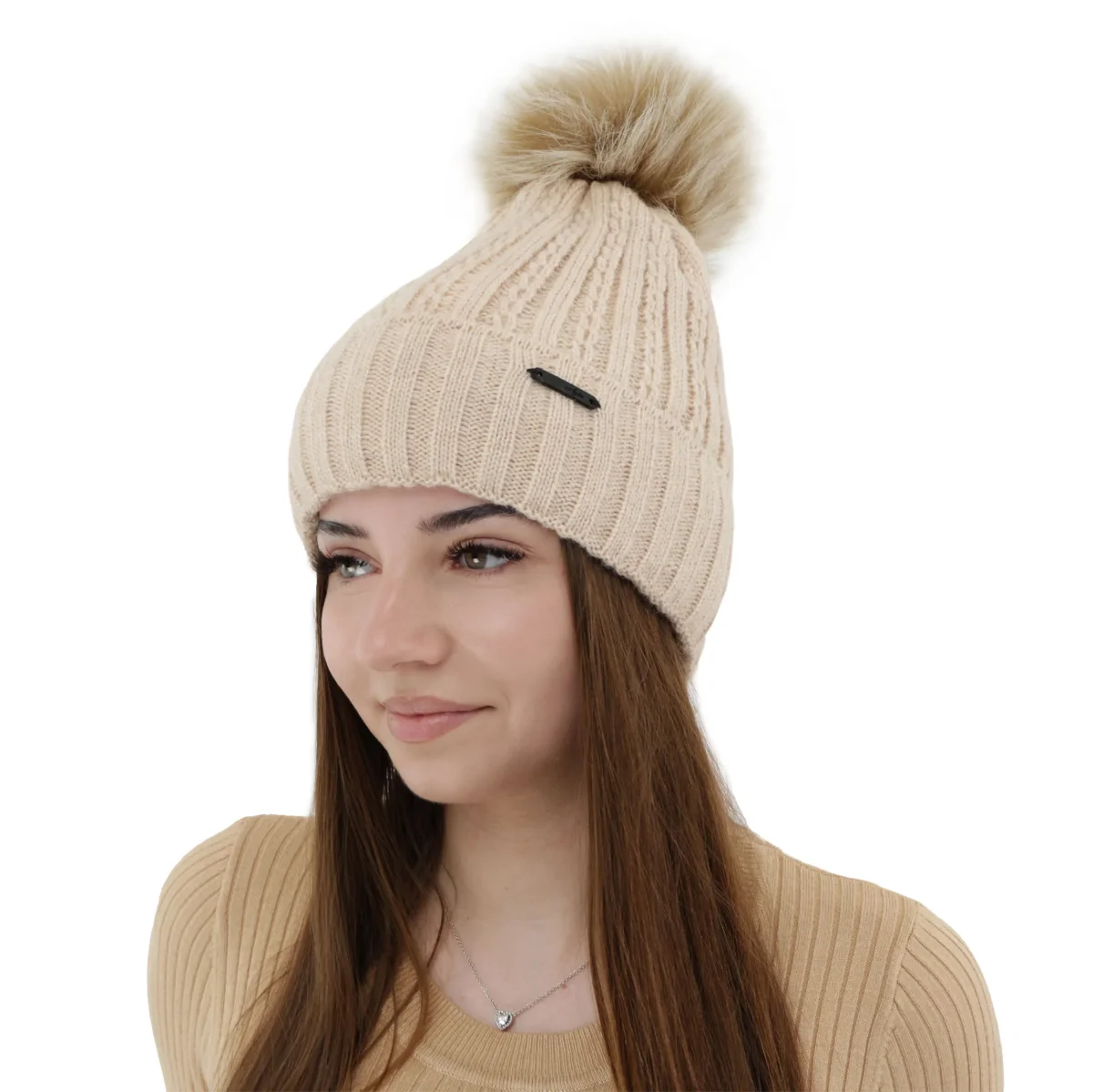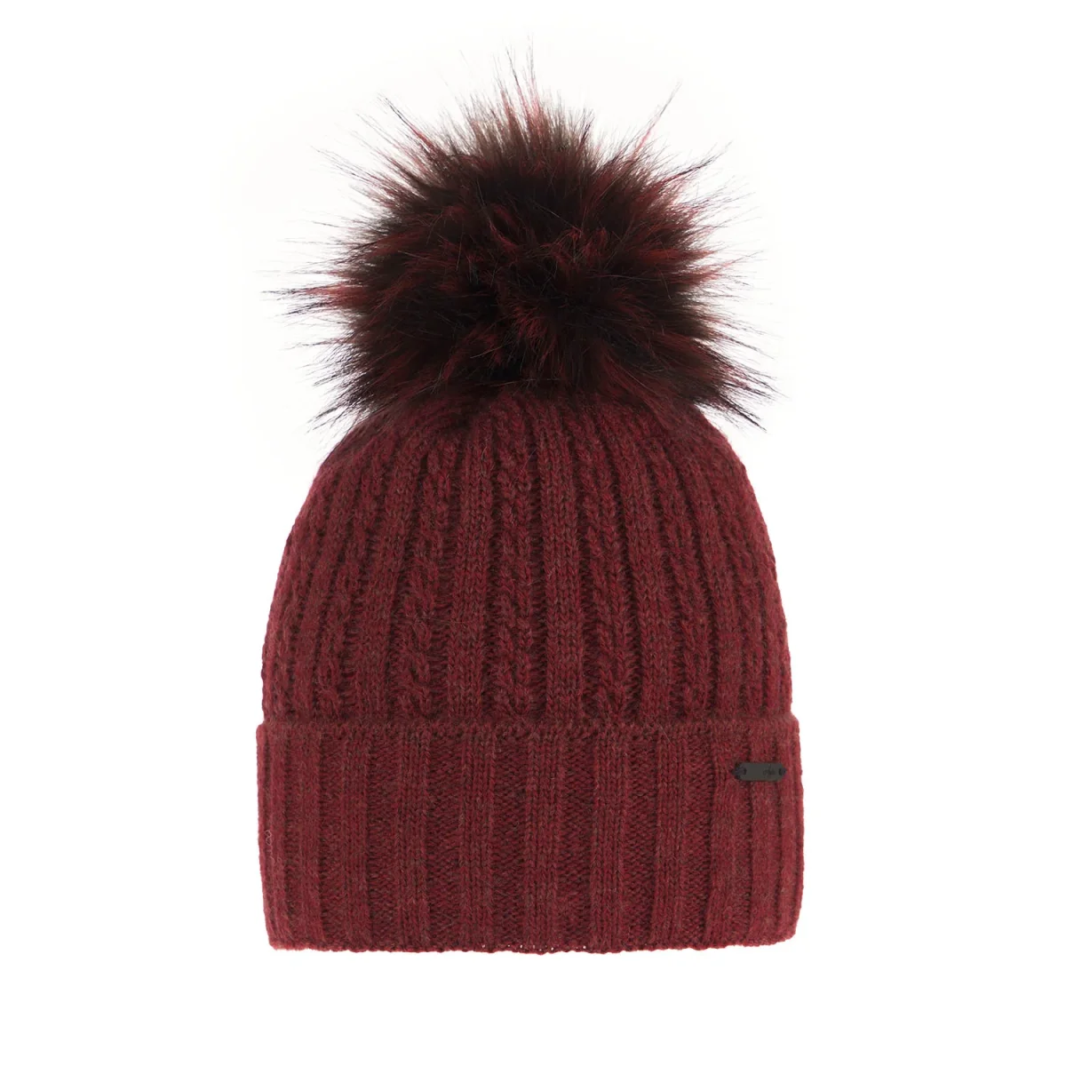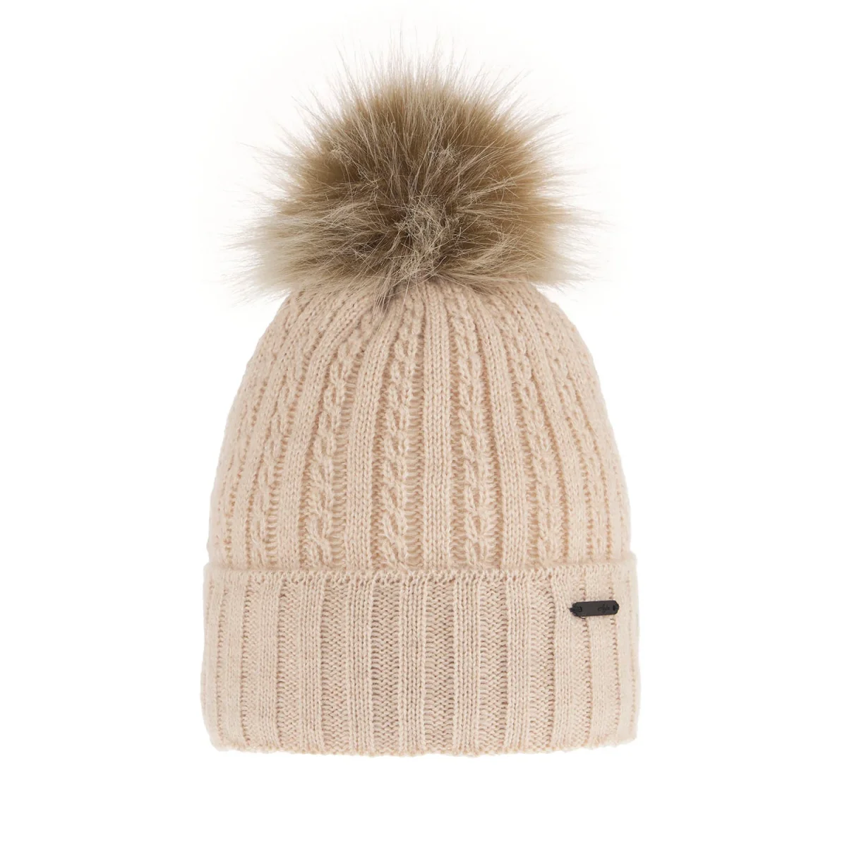 Cappello modello beanie con pon pon. Motivo lavorato a coste alternato liscio ed a trecce. Risvolto alto con logo brand cucito. Interno in pile. Composizione tessuto esterno 90% acrilico, 10% lana merino, interno 100% acrilico.